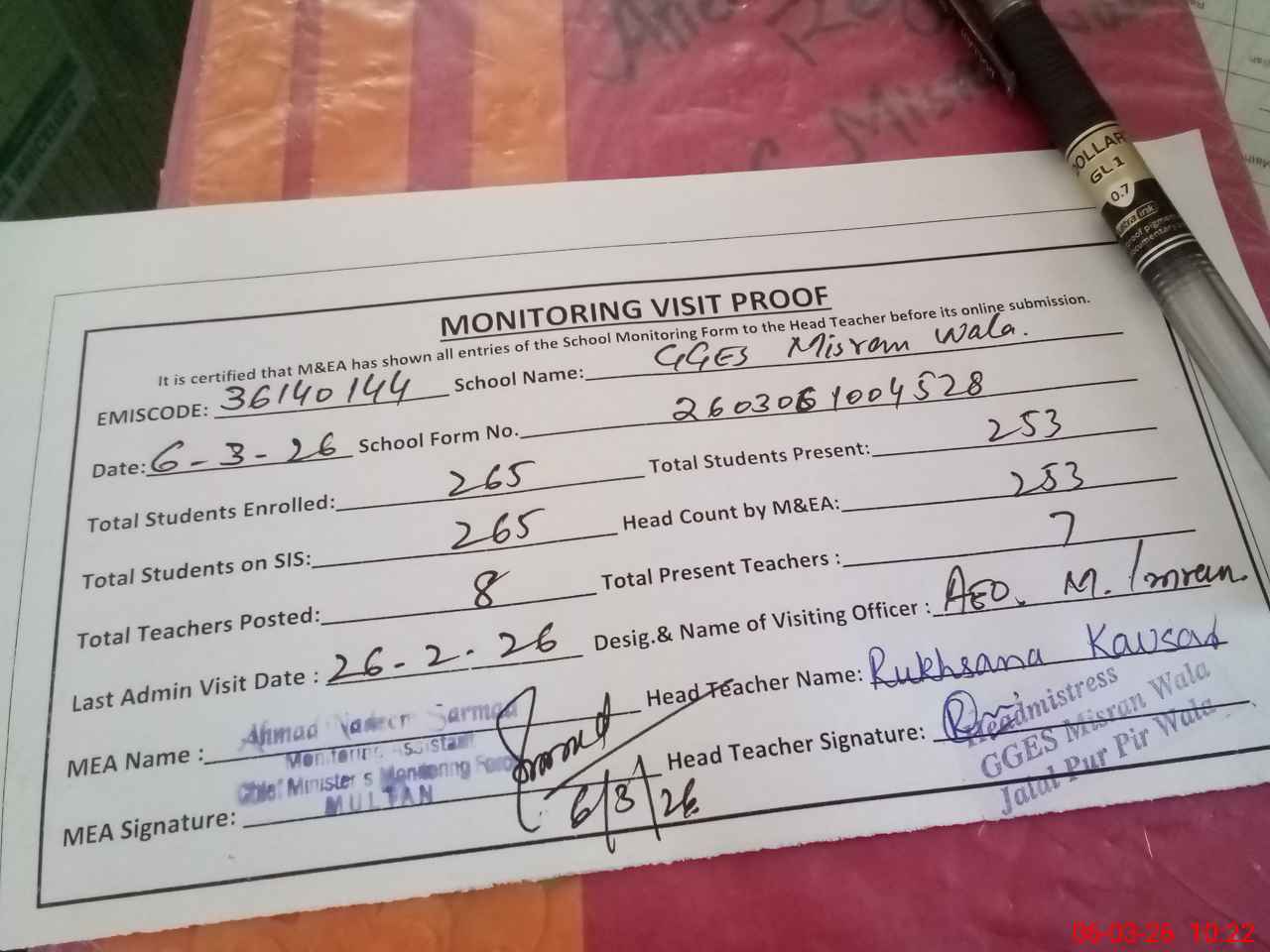 | Attendance Register | Head Teacher | MEA with School | Visit Proof |