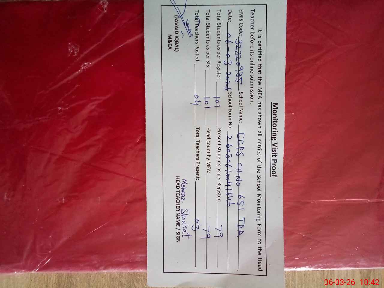 | Attendance Register | Head Teacher | MEA with School | Visit Proof |