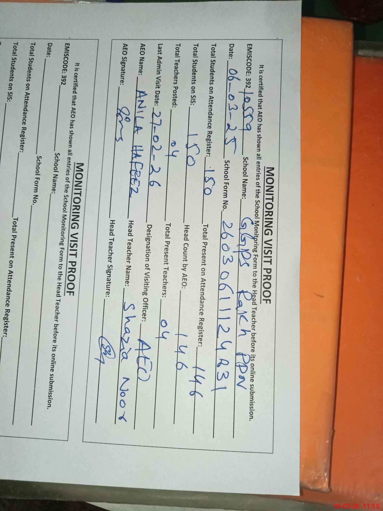 | Attendance Register | Head Teacher | MEA with School | Visit Proof |