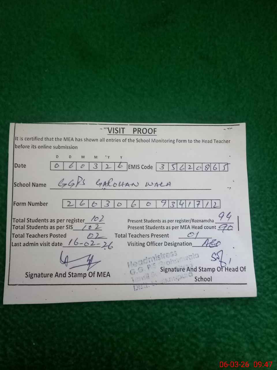 | Attendance Register | Head Teacher | MEA with School | Visit Proof |