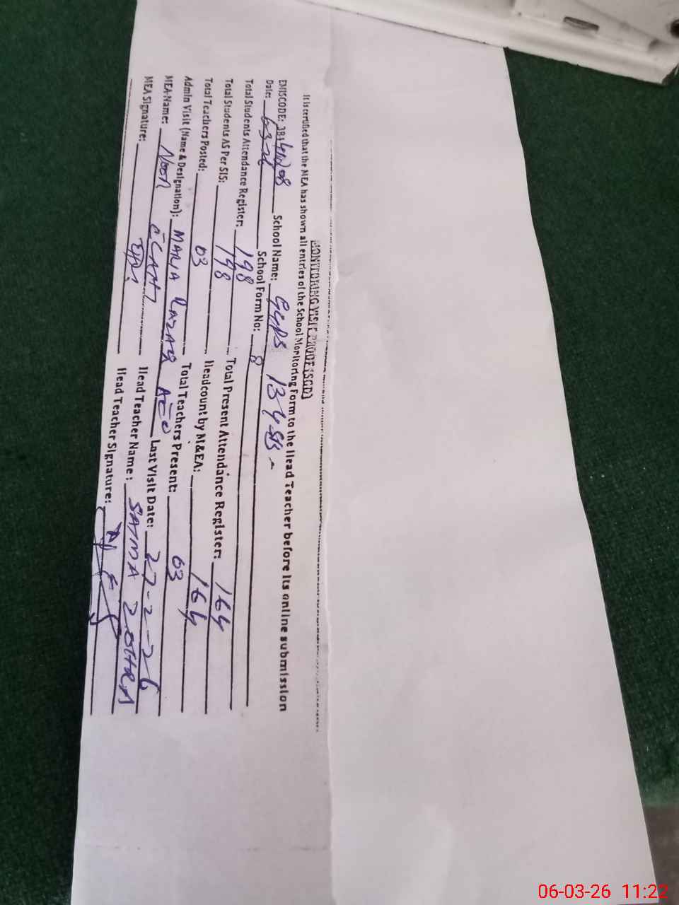 | Attendance Register | Head Teacher | MEA with School | Visit Proof |
