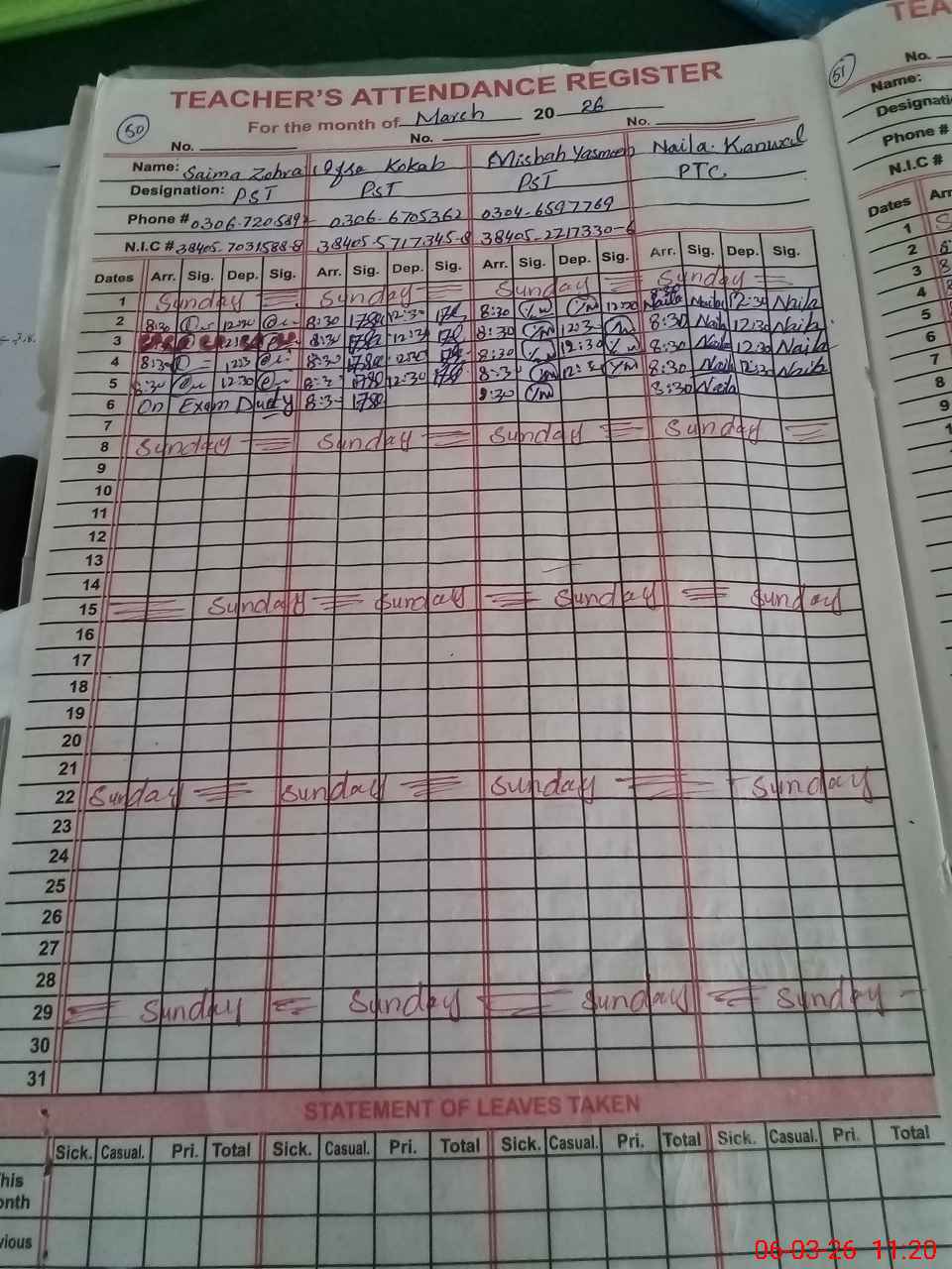 | 38**** | Sa**** Zo**** | PST Science/Maths | Regular | 0 | 0 | 0 | 0 | 0 | 0 | 0 | 0 | 0 | Exam Duty |