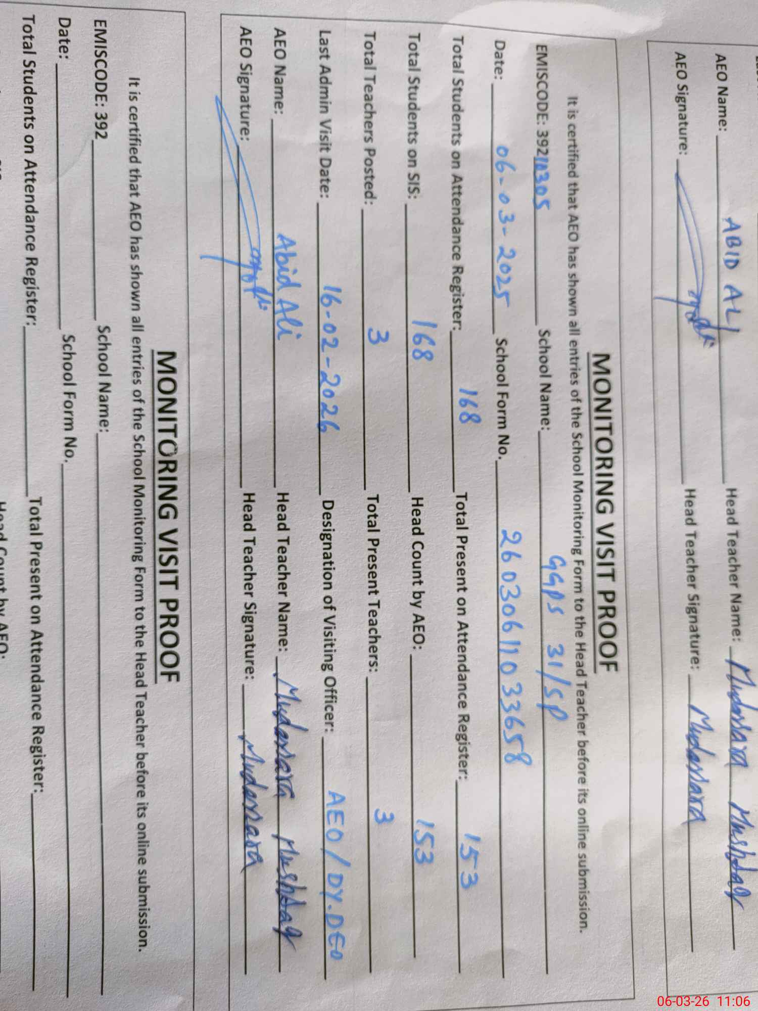 | Certified that this School was Inspected by the Undersigned MEA/DMO Today and the Information Stated Above is as Per Record. | |||||