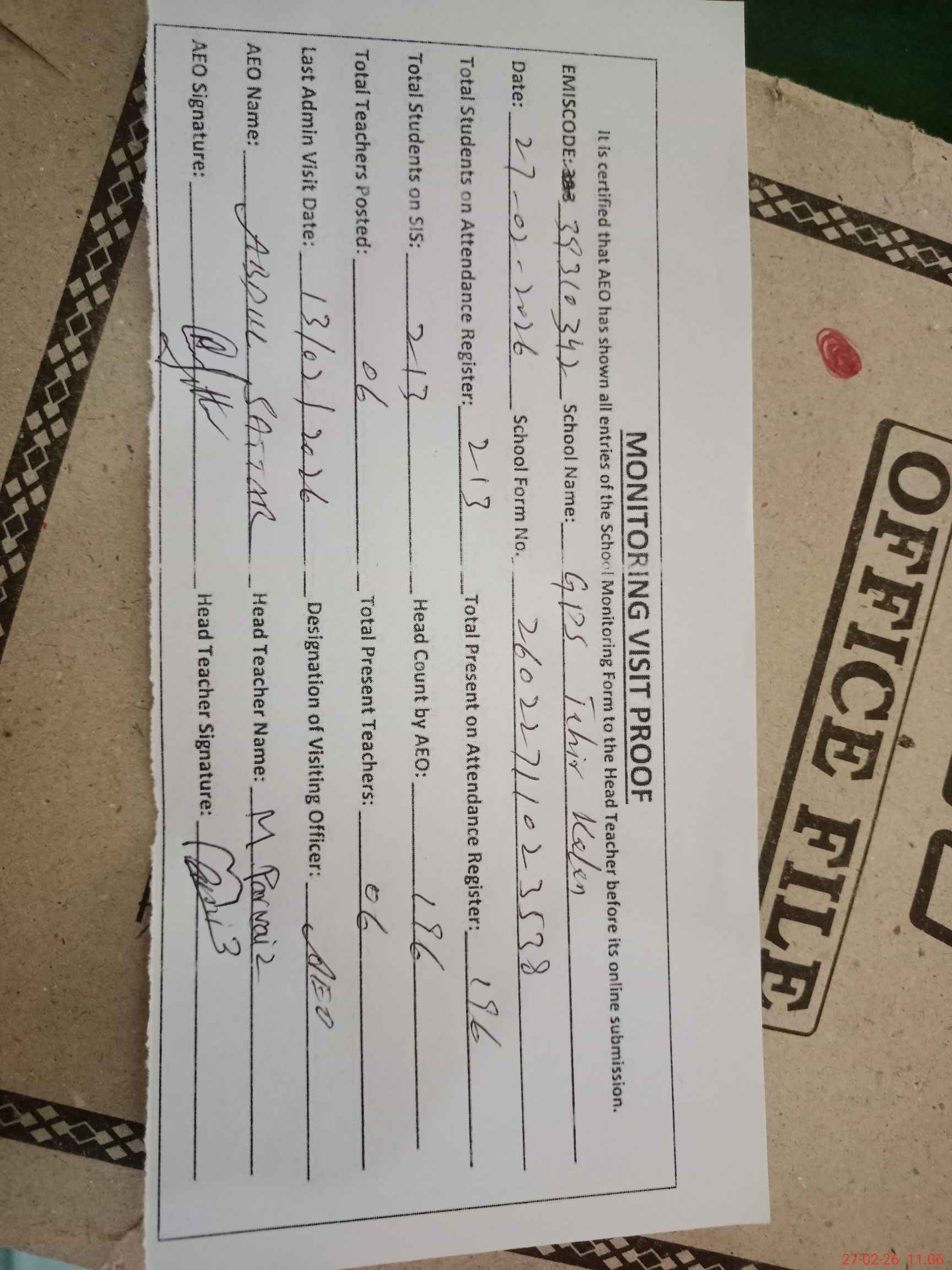 | Attendance Register | Head Teacher | MEA with School | Visit Proof |
