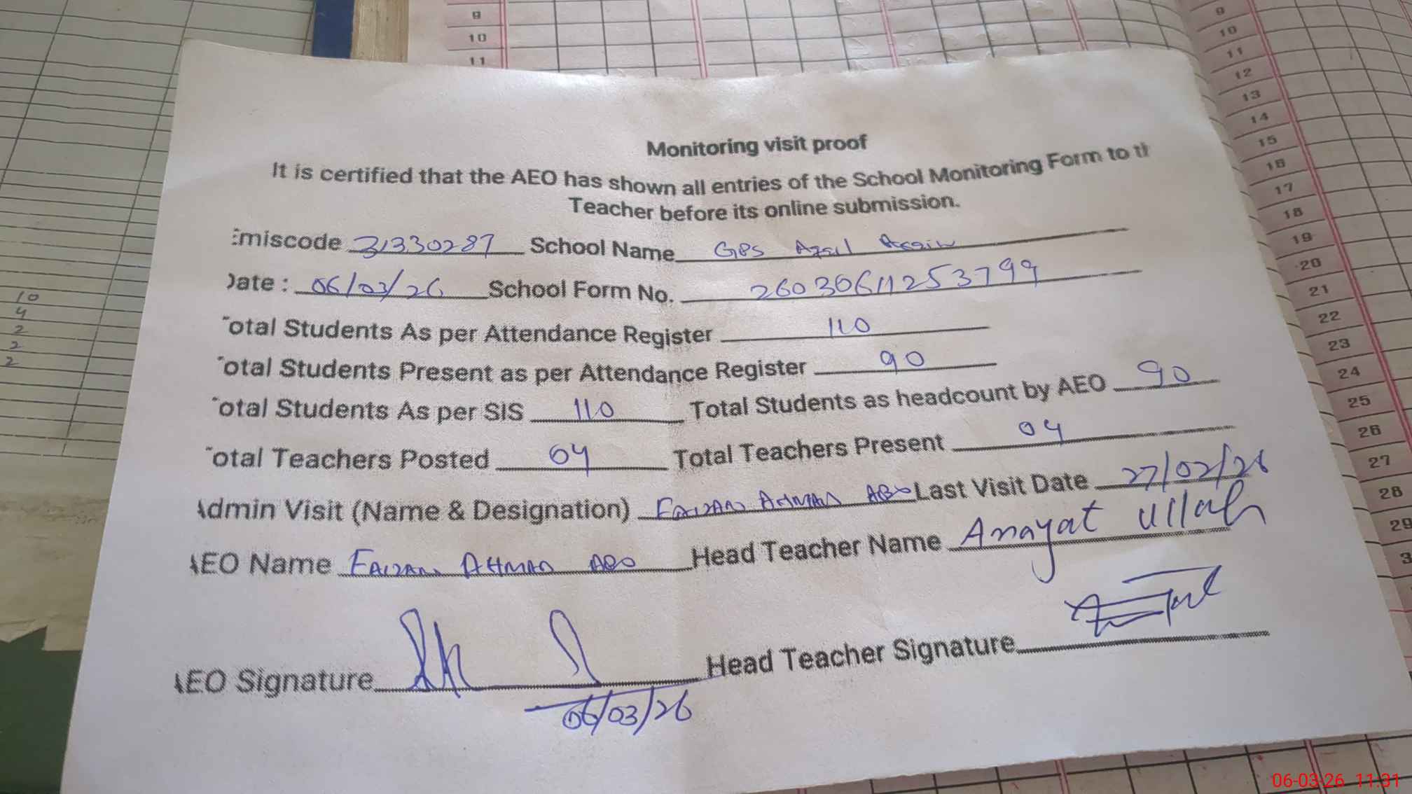 | Attendance Register | Head Teacher | MEA with School | Visit Proof |