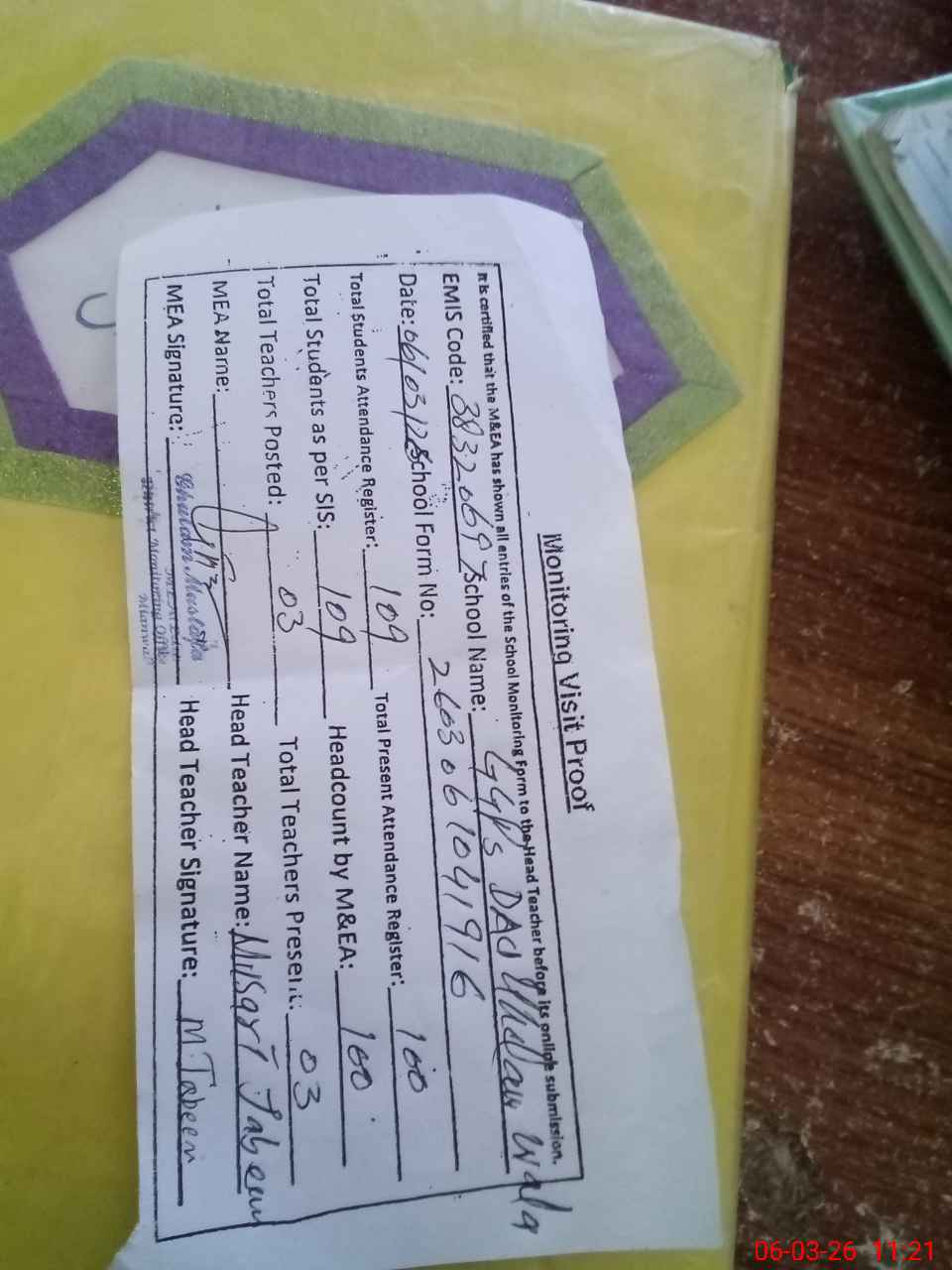 | Attendance Register | Head Teacher | MEA with School | Visit Proof |