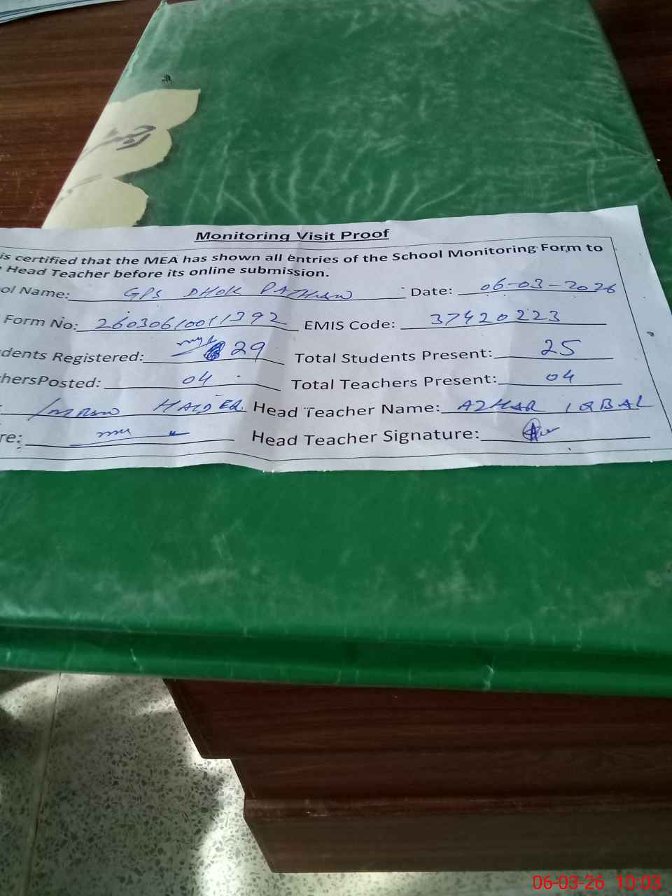 | Attendance Register | Head Teacher | MEA with School | Visit Proof |