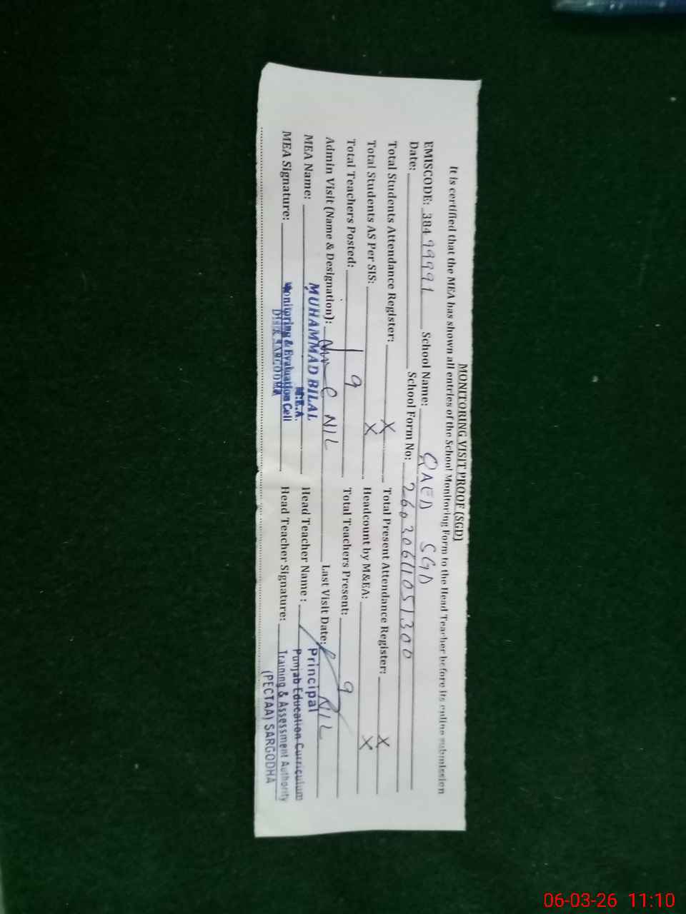 | Attendance Register | Head Teacher | MEA with School | Visit Proof |