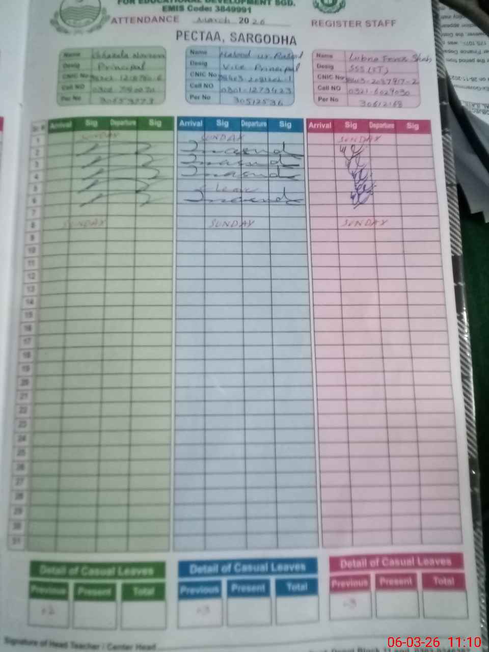 | CNIC | Full Name | Designation | R/C | Absence During Last Calender Month |