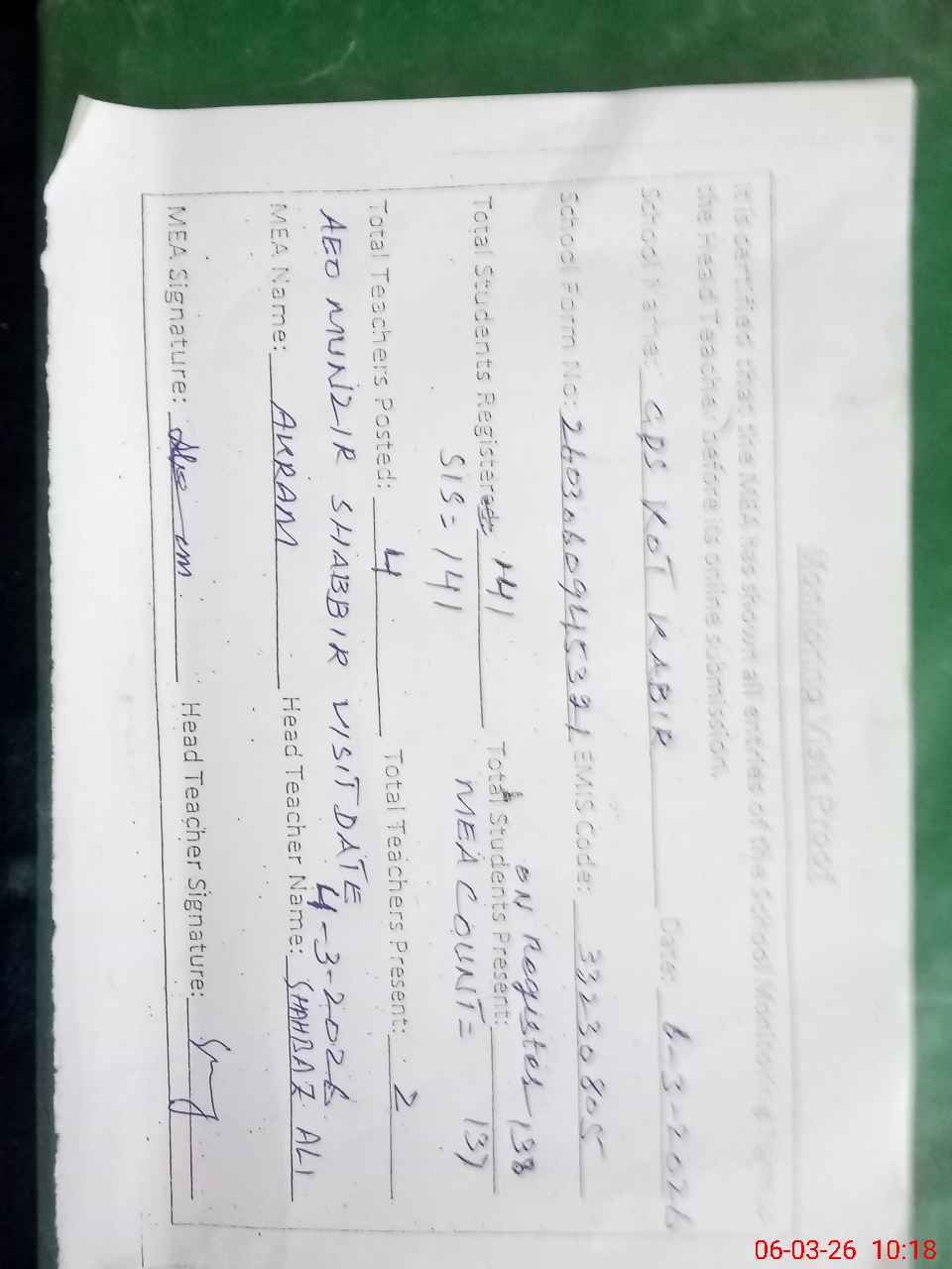 | Attendance Register | Head Teacher | MEA with School | Visit Proof |