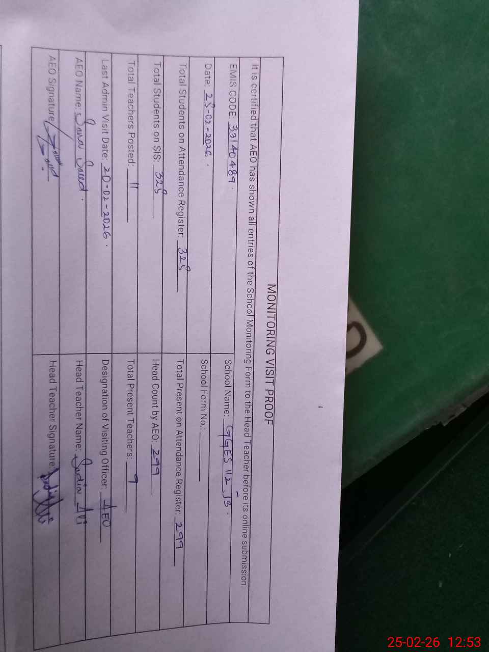 | EMIS Code: 33140489 | Name of School: GGES CHAK 112 JB | |||