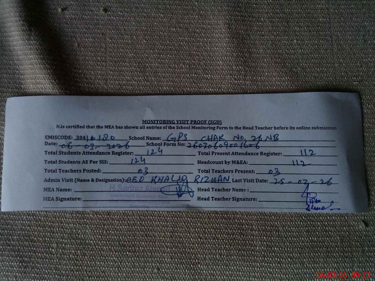 | EMIS Code: 38410180 | Name of School: GPS CHAK NO.26 NB | |||