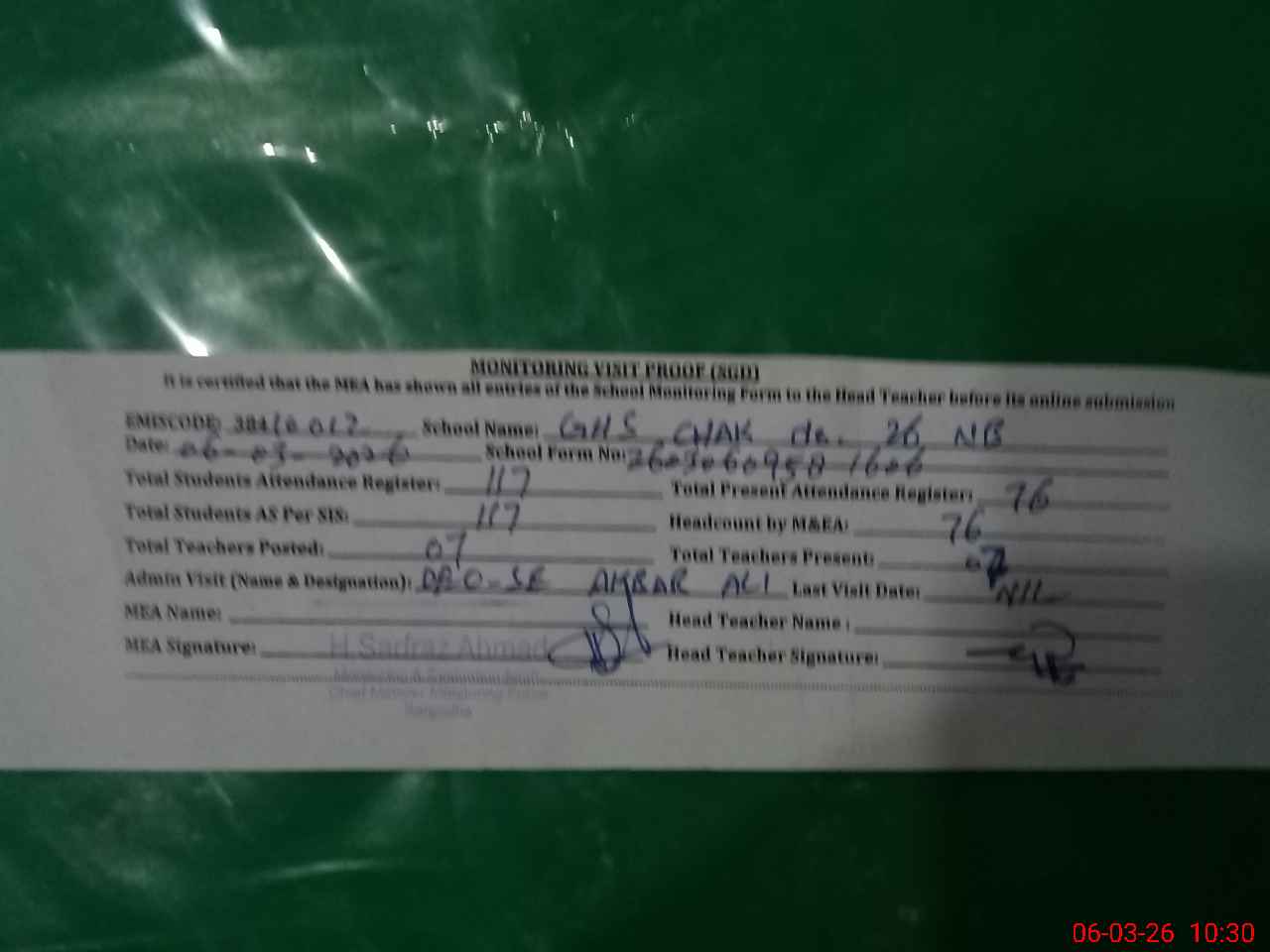 | EMIS Code: 38410012 | Name of School: GHS CHAK NO.26 NB | |||