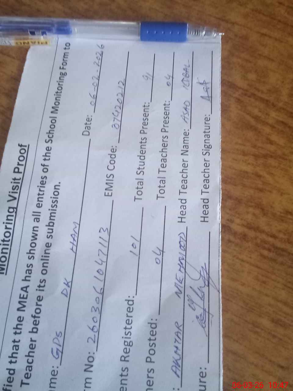 | Attendance Register | Head Teacher | MEA with School | Visit Proof |