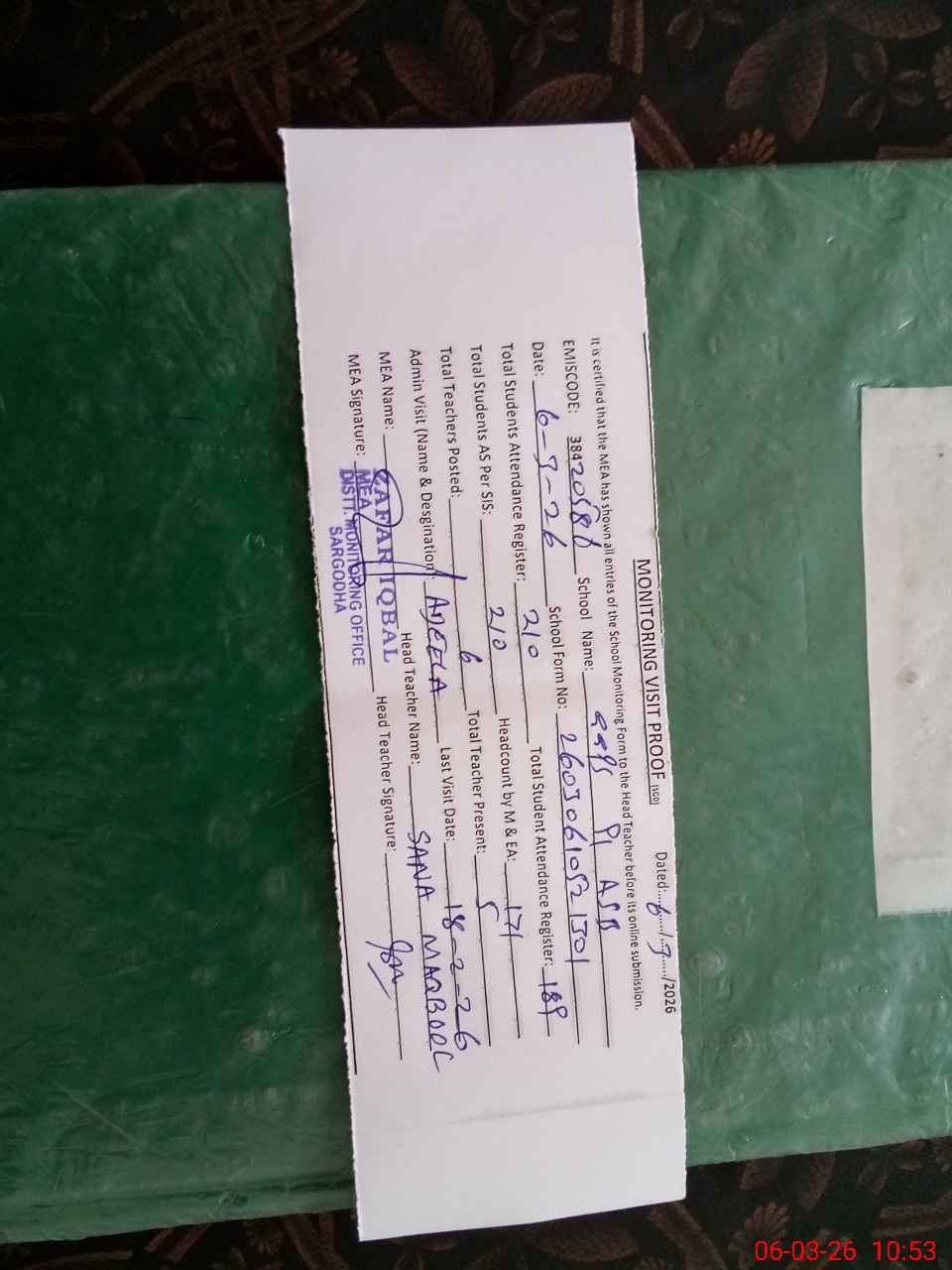 | Monitoring Date: 06-03-2026 | Start Time: 06-03-2026 10:16 AM | End Time: 06-03-2026 10:53 AM | Name of MEA: ZA**** IQ**** | |