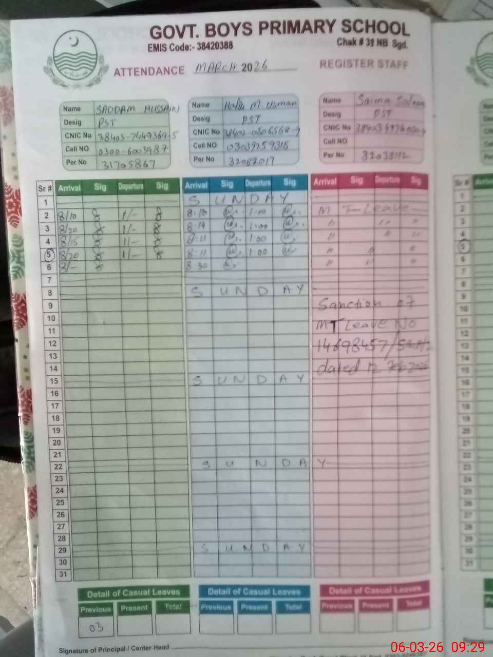| Name: SA**** HU**** Designation: (School Headmaster's/Headmistress's) PST Phone/Cell Number: 03**** |