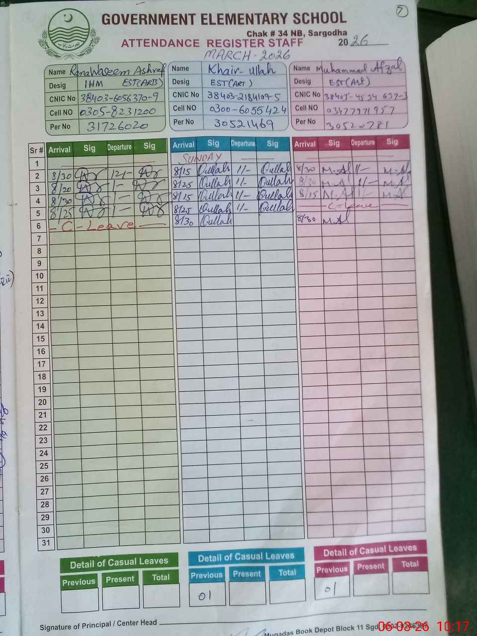 | CNIC | Full Name | Designation | R/C | Absence during last cal. month |