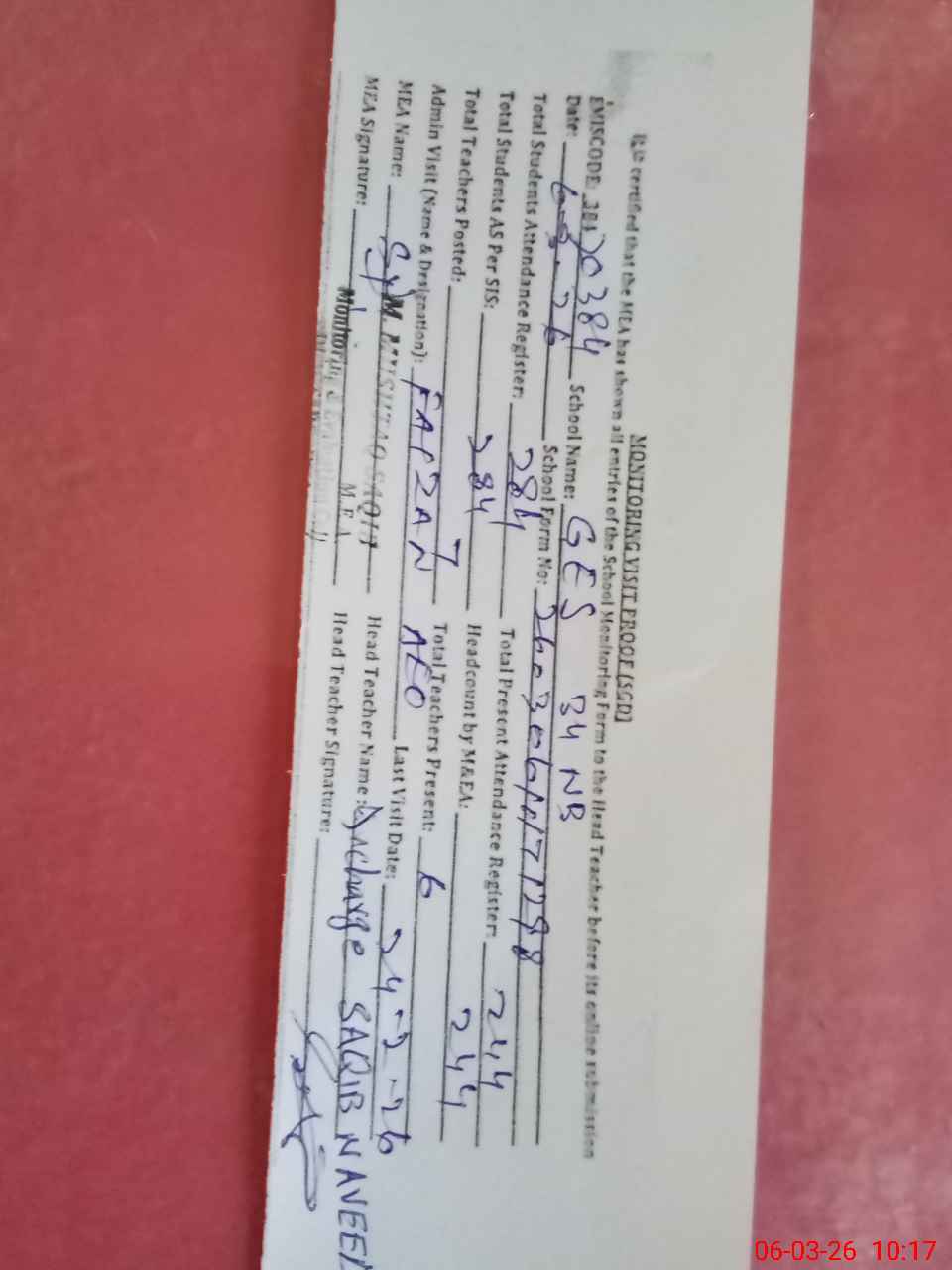 | Attendance Register | Head Teacher | MEA with School | Visit Proof |