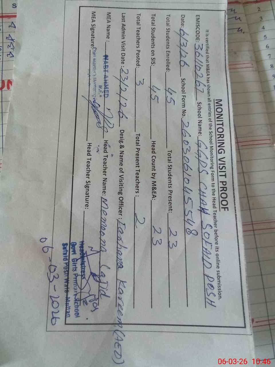 | EMIS Code: 36110267 | Name of School: GGPS CHAH SOFAID POSH VEHARI ROAD MULTAN | |||