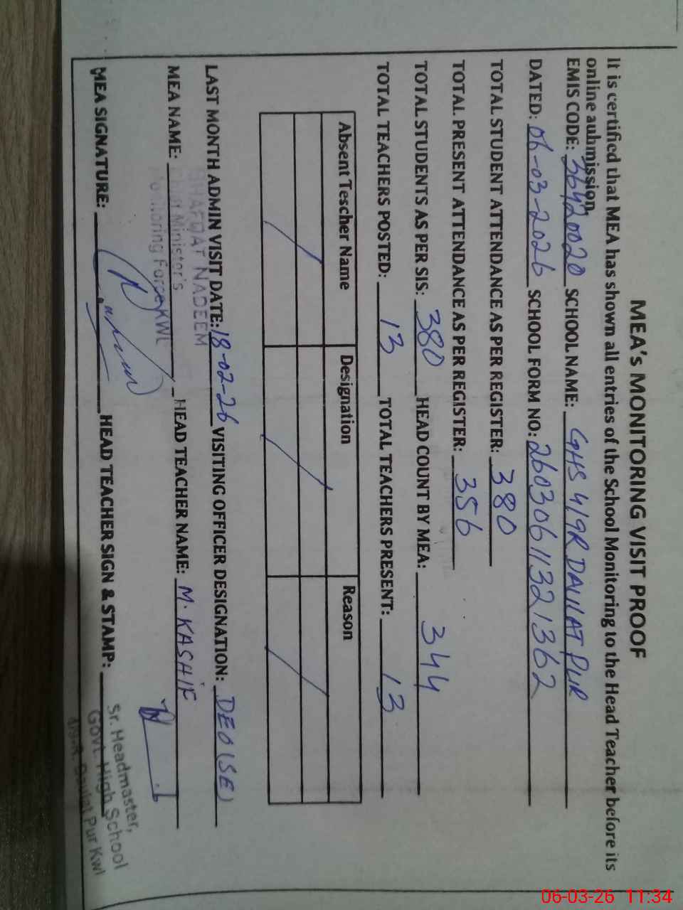 | Attendance Register | Head Teacher | MEA with School | Visit Proof |