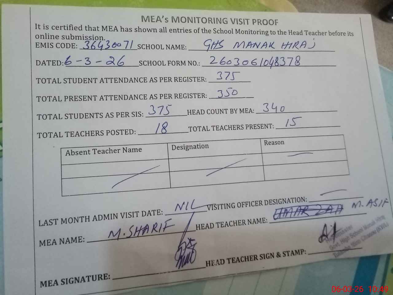 | Attendance Register | Head Teacher | MEA with School | Visit Proof |
