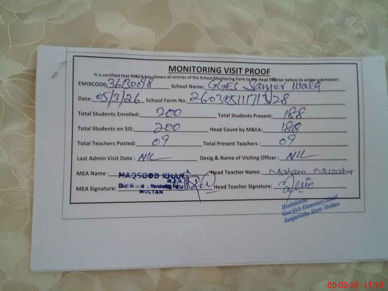 | Attendance Register | Head Teacher | MEA with School | Visit Proof |