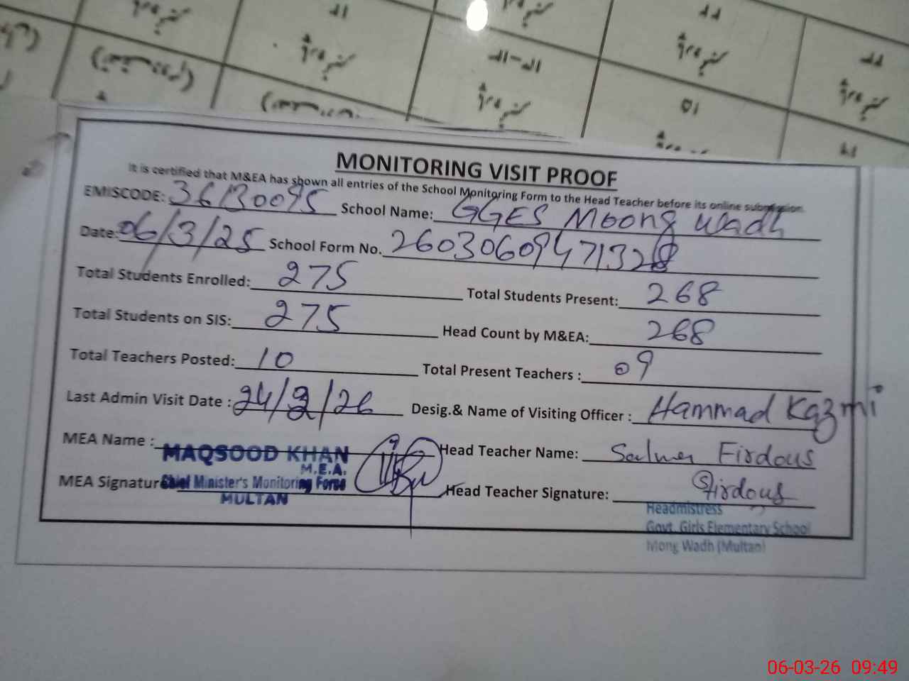 | Certified that this School was Inspected by the Undersigned MEA/DMO Today and the Information Stated Above is as Per Record. | |||||