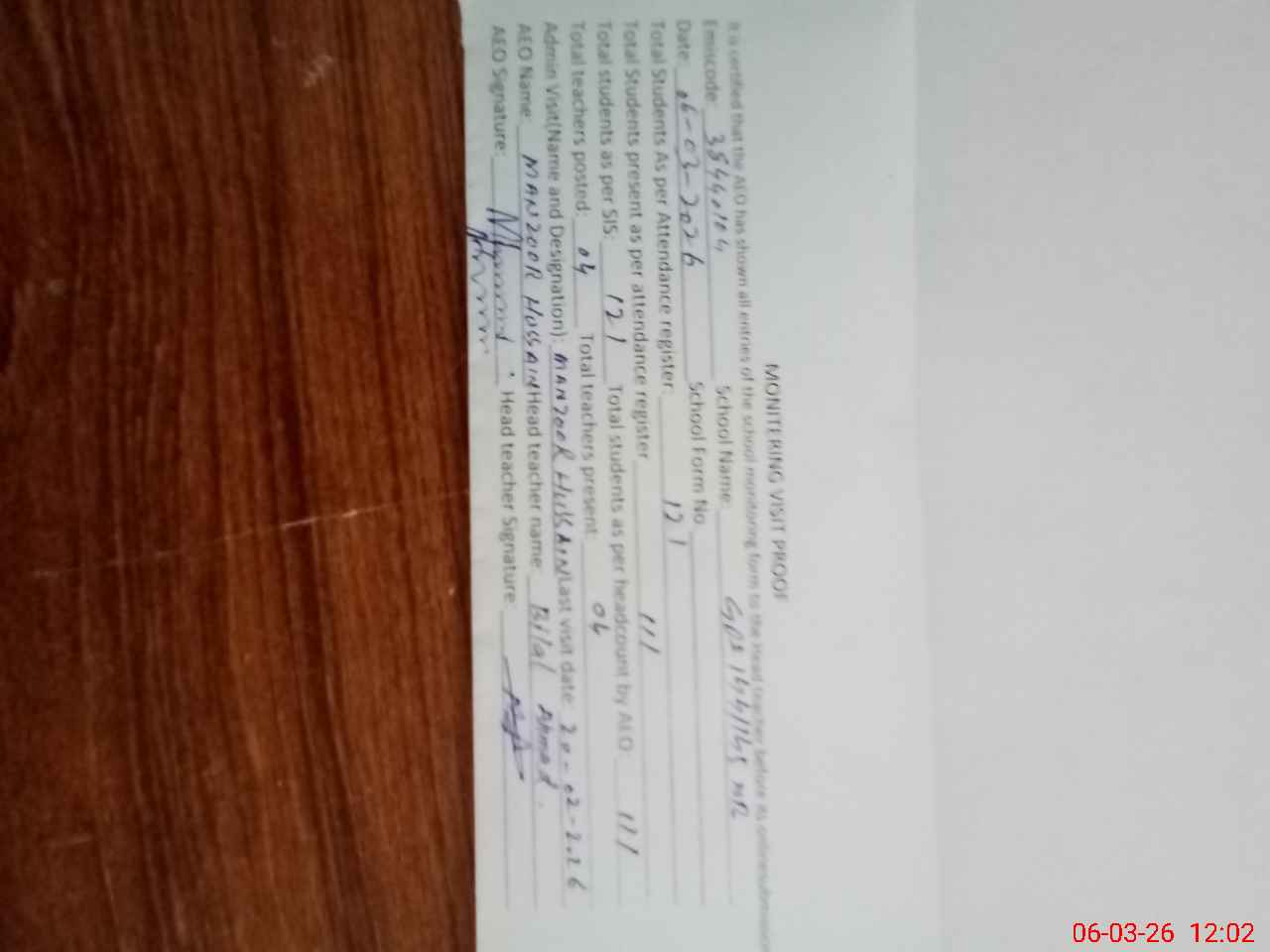 | Attendance Register | Head Teacher | MEA with School | Visit Proof |