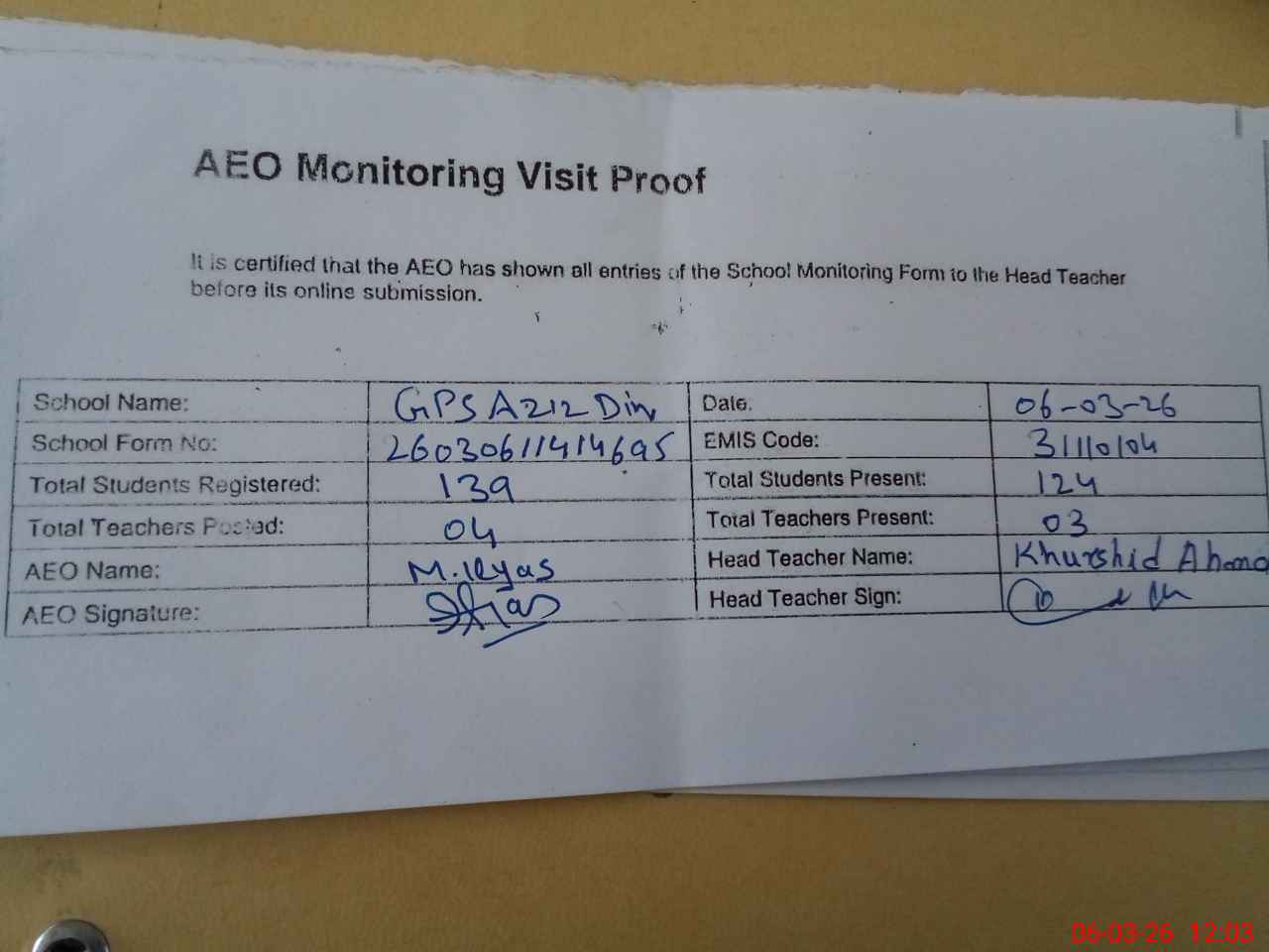 | Attendance Register | Head Teacher | MEA with School | Visit Proof |
