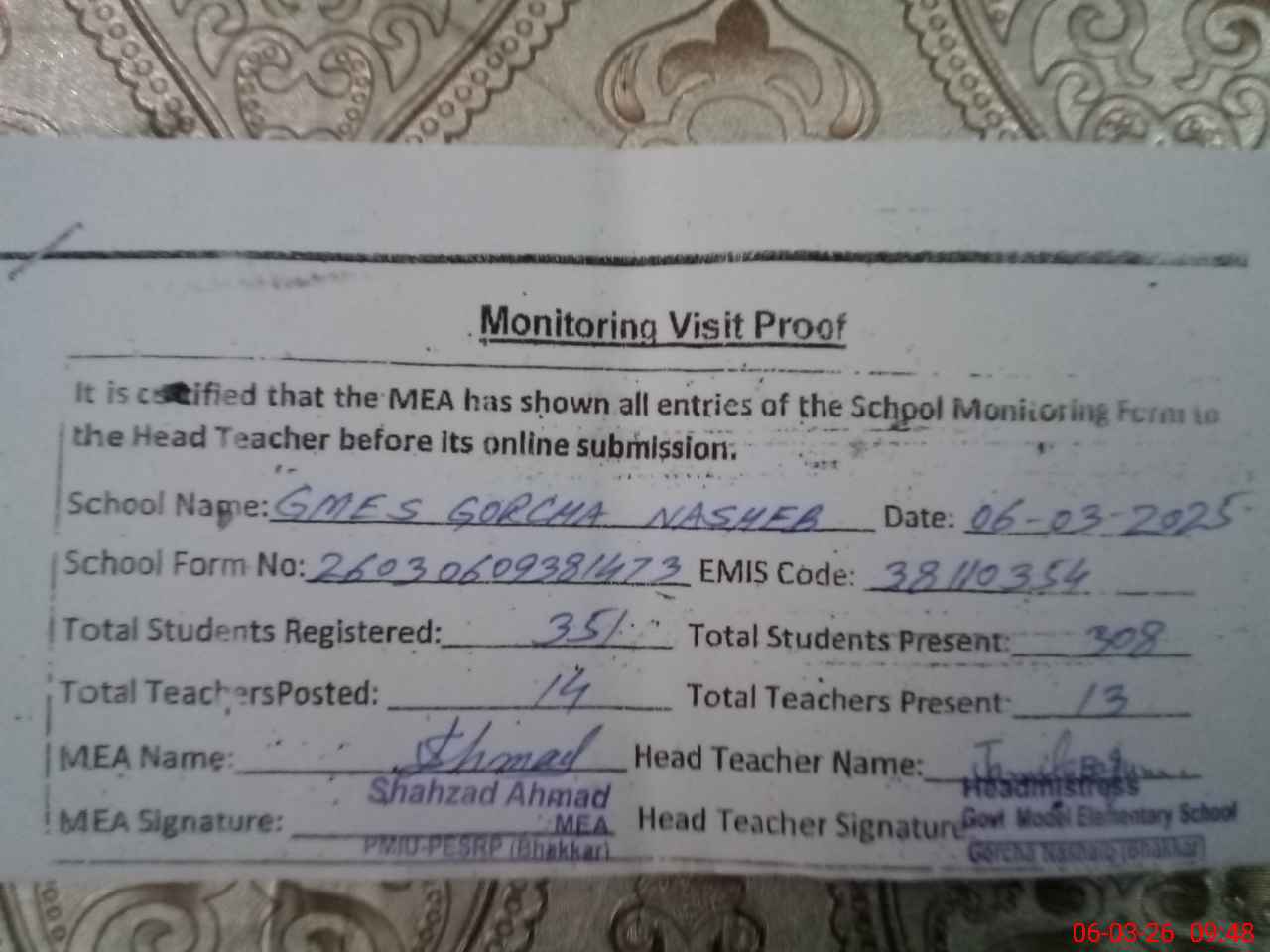 | Certified that this School was Inspected by the Undersigned MEA/DMO Today and the Information Stated Above is as Per Record. | |||||