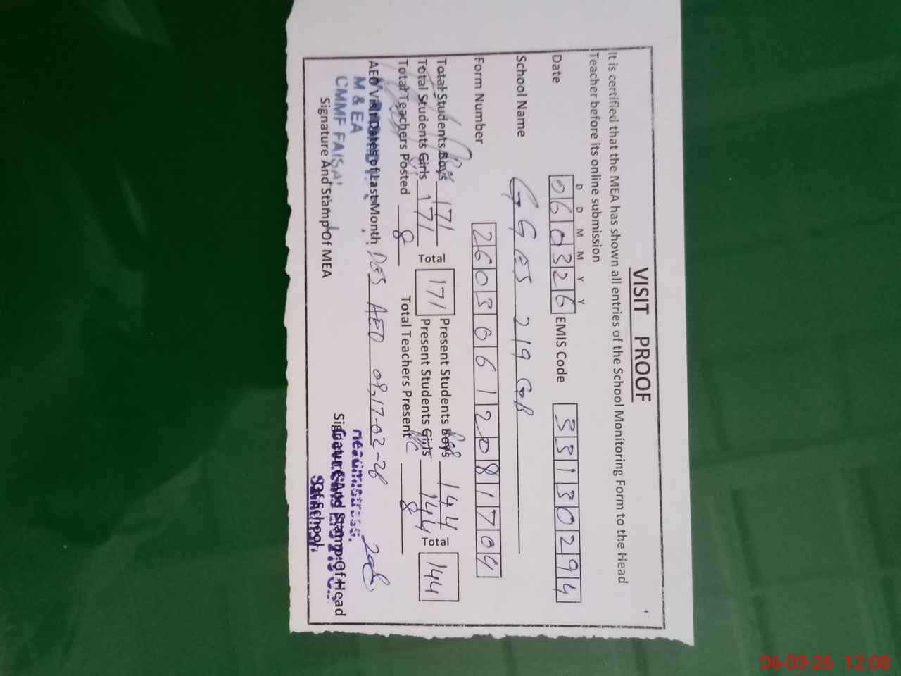 | Attendance Register | Head Teacher | MEA with School | Visit Proof |