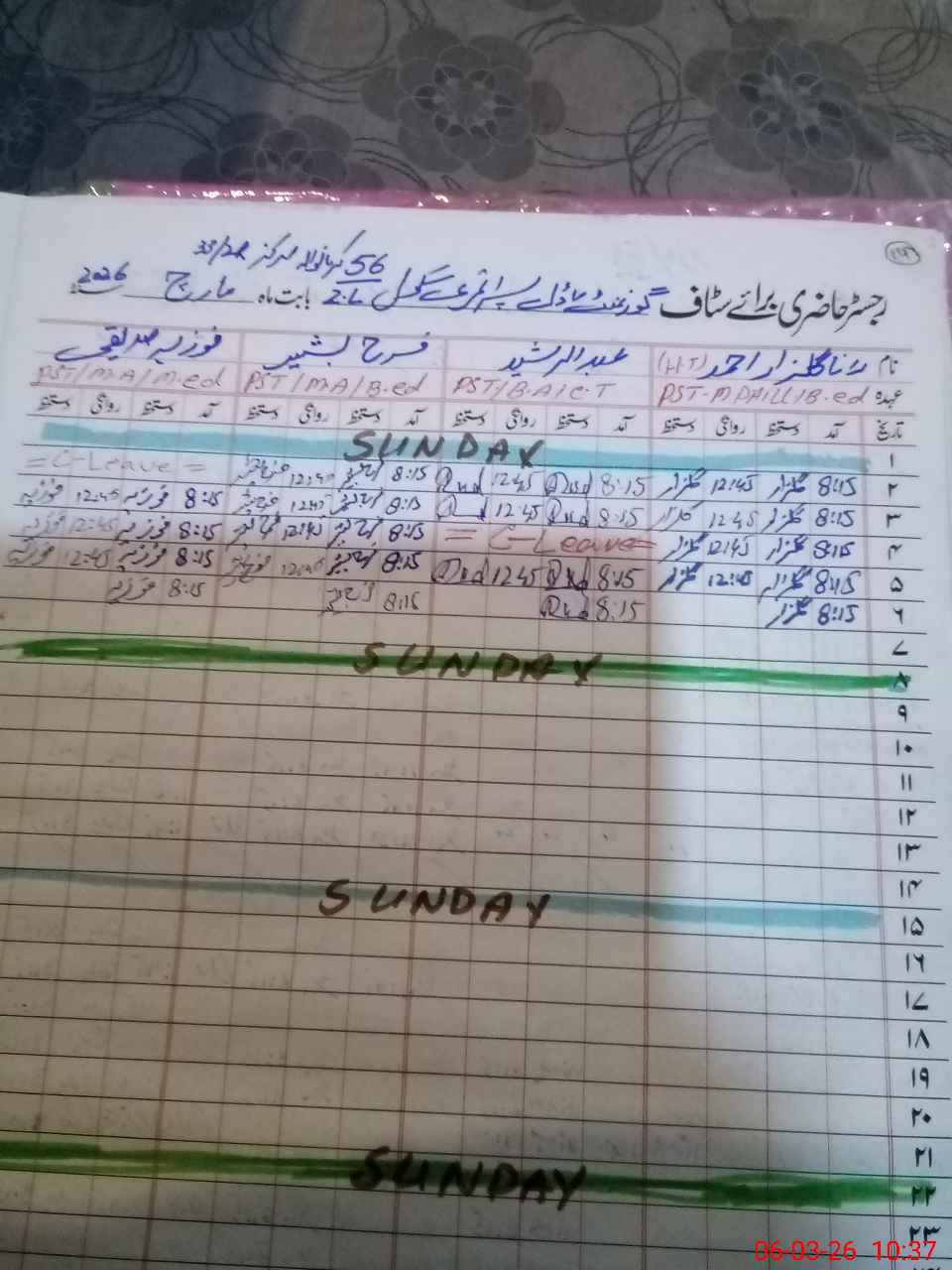 | Leave | Duty | Absent | Maternity | Medical | Ex- Pak |