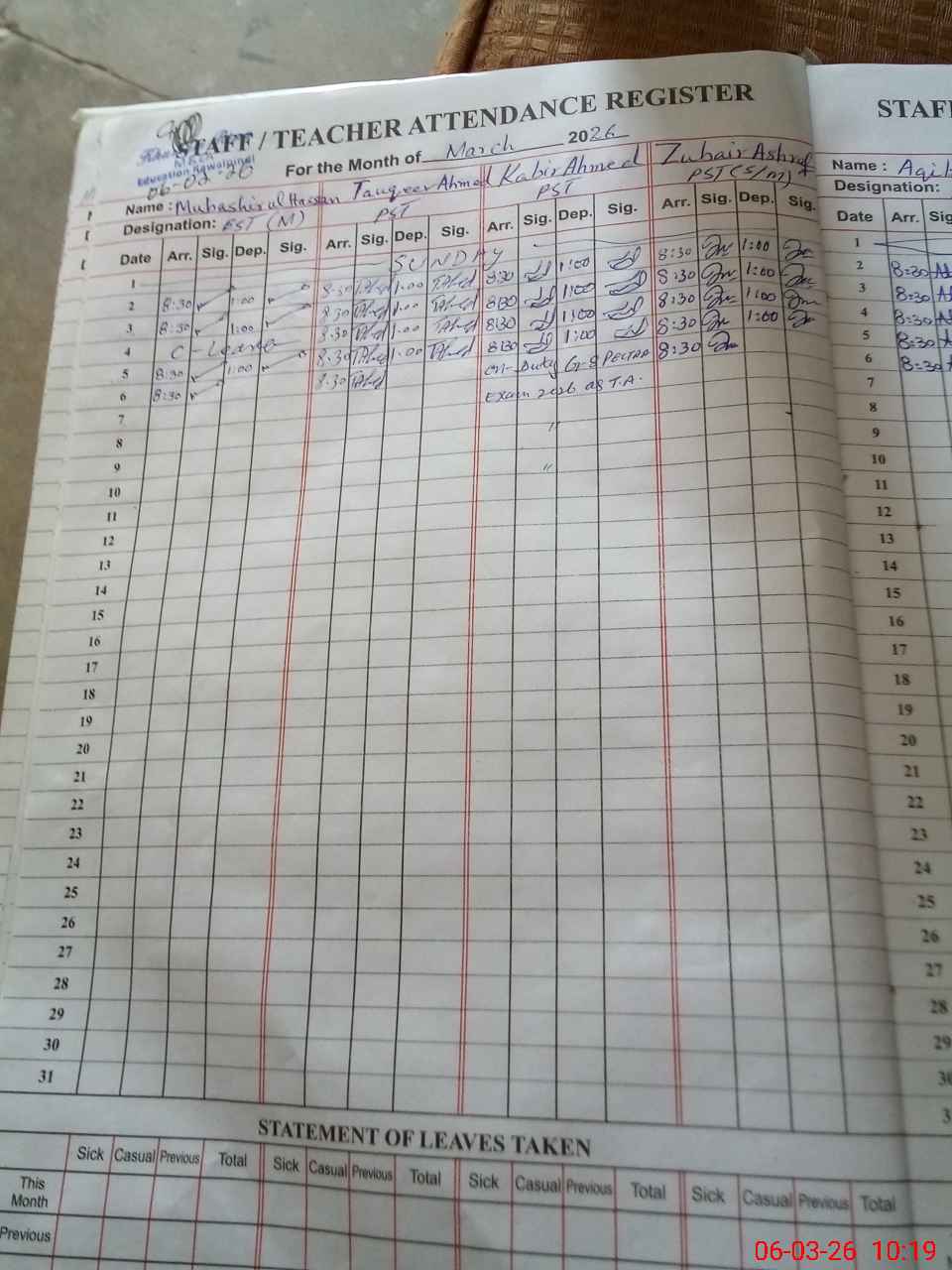 | 37**** | Ab**** Ra**** | EST Urdu | Regular | 0 | 0 | 0 | 0 | 0 | 0 | 0 | 0 | 0 | Exam Duty |