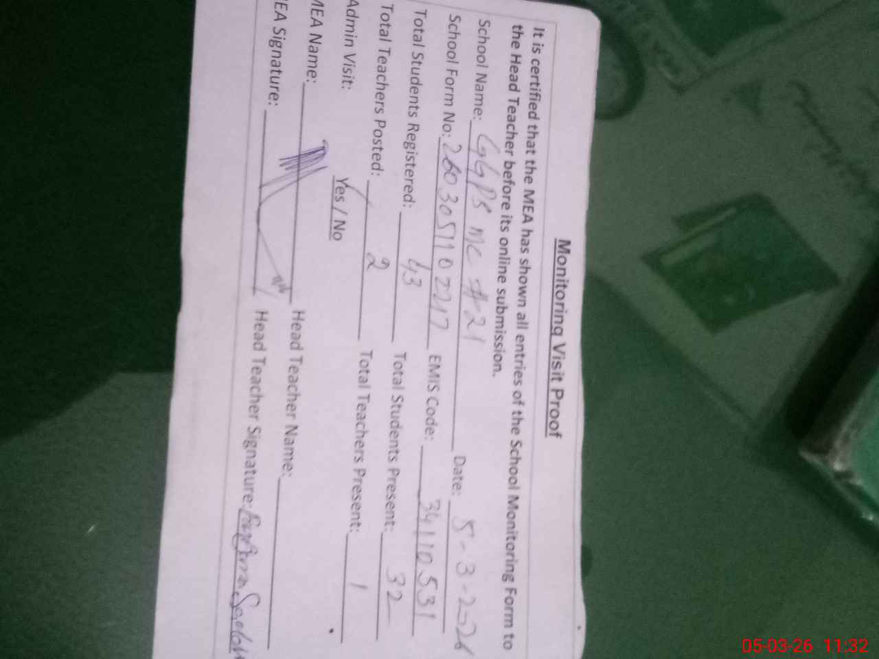 | Attendance Register | Head Teacher | MEA with School | Visit Proof |