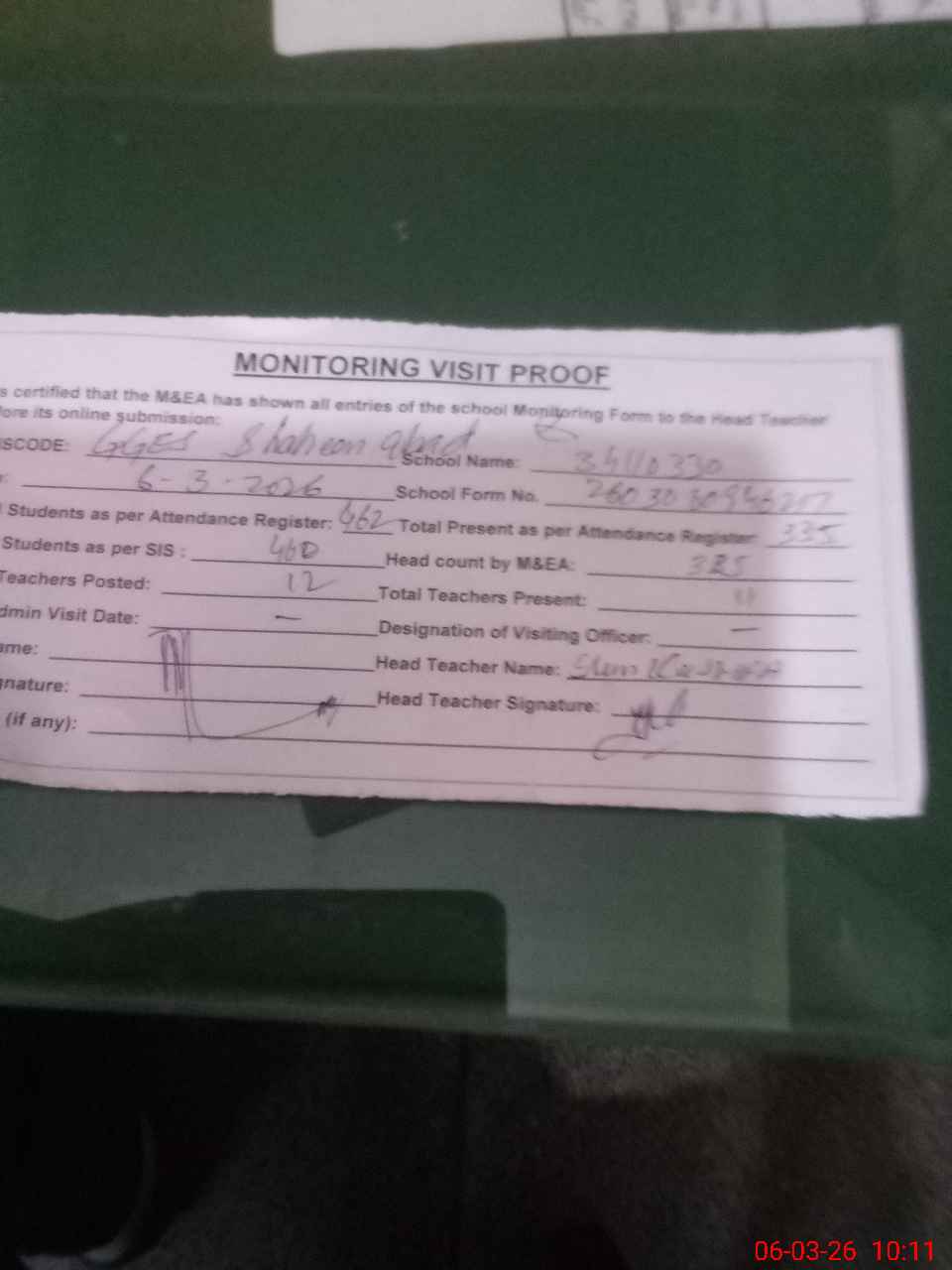| Attendance Register | Head Teacher | MEA with School | Visit Proof |