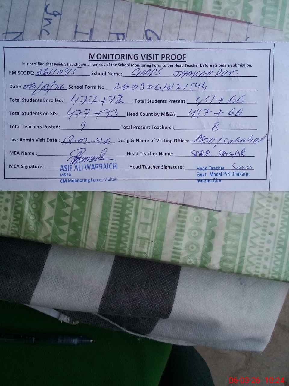 | Certified that this School was Inspected by the Undersigned MEA/DMO Today and the Information Stated Above is as Per Record. | |||||