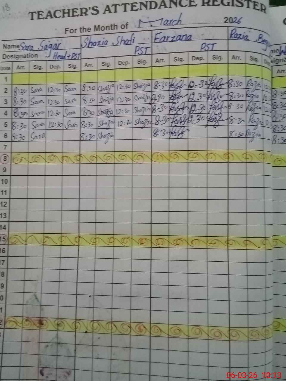 | No. of Students Present - Male | 0 | 0 | 0 | 0 | 0 | 0 | 0 | 1 | 2 | 3 | 0 | 0 | 6 | |||