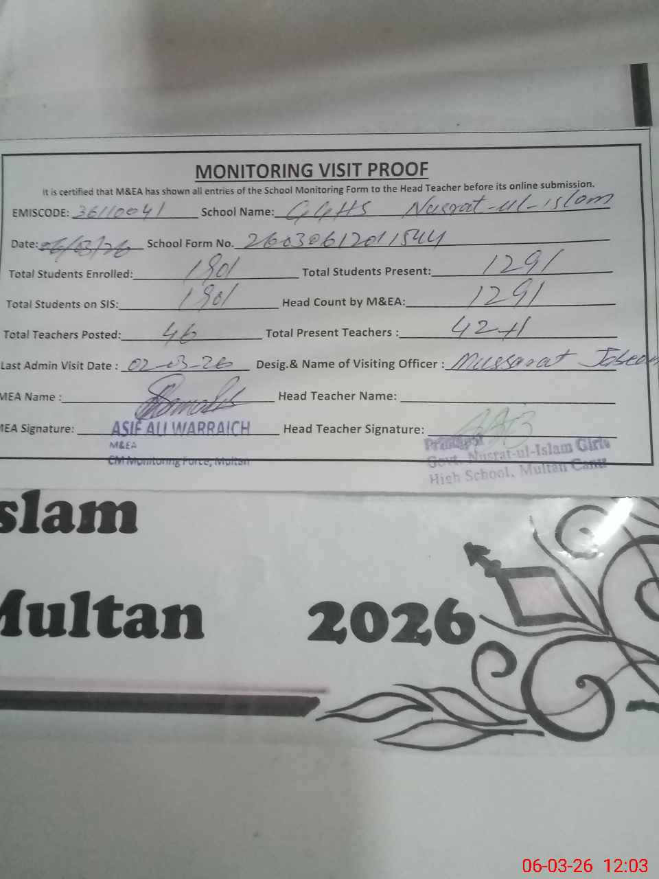 | Attendance Register | Head Teacher | MEA with School | Visit Proof |