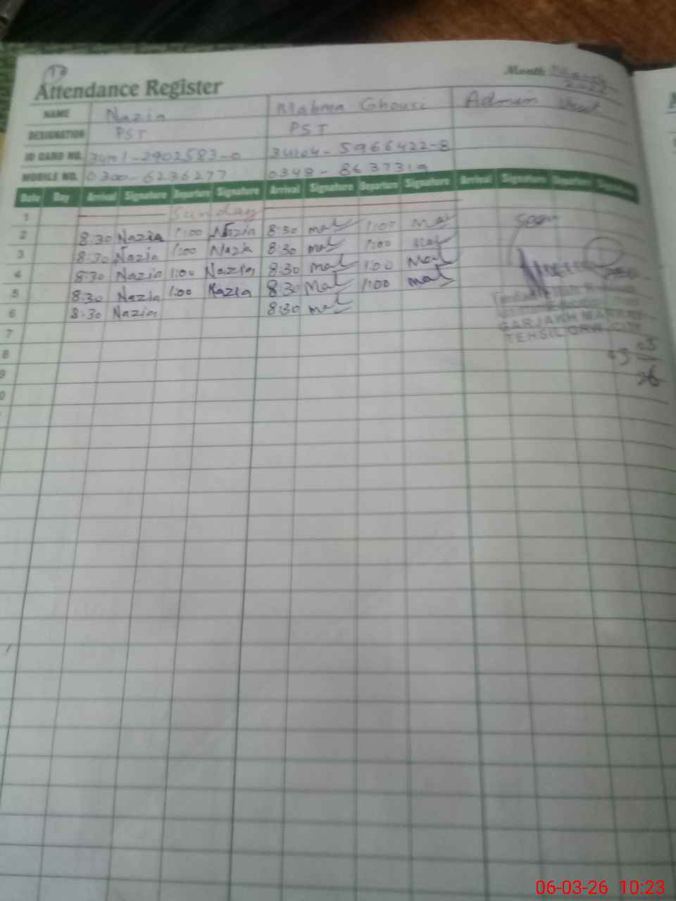| Name: MU**** SA**** Designation: (School Headmaster's/Headmistress's) PST Phone/Cell Number: 03**** |