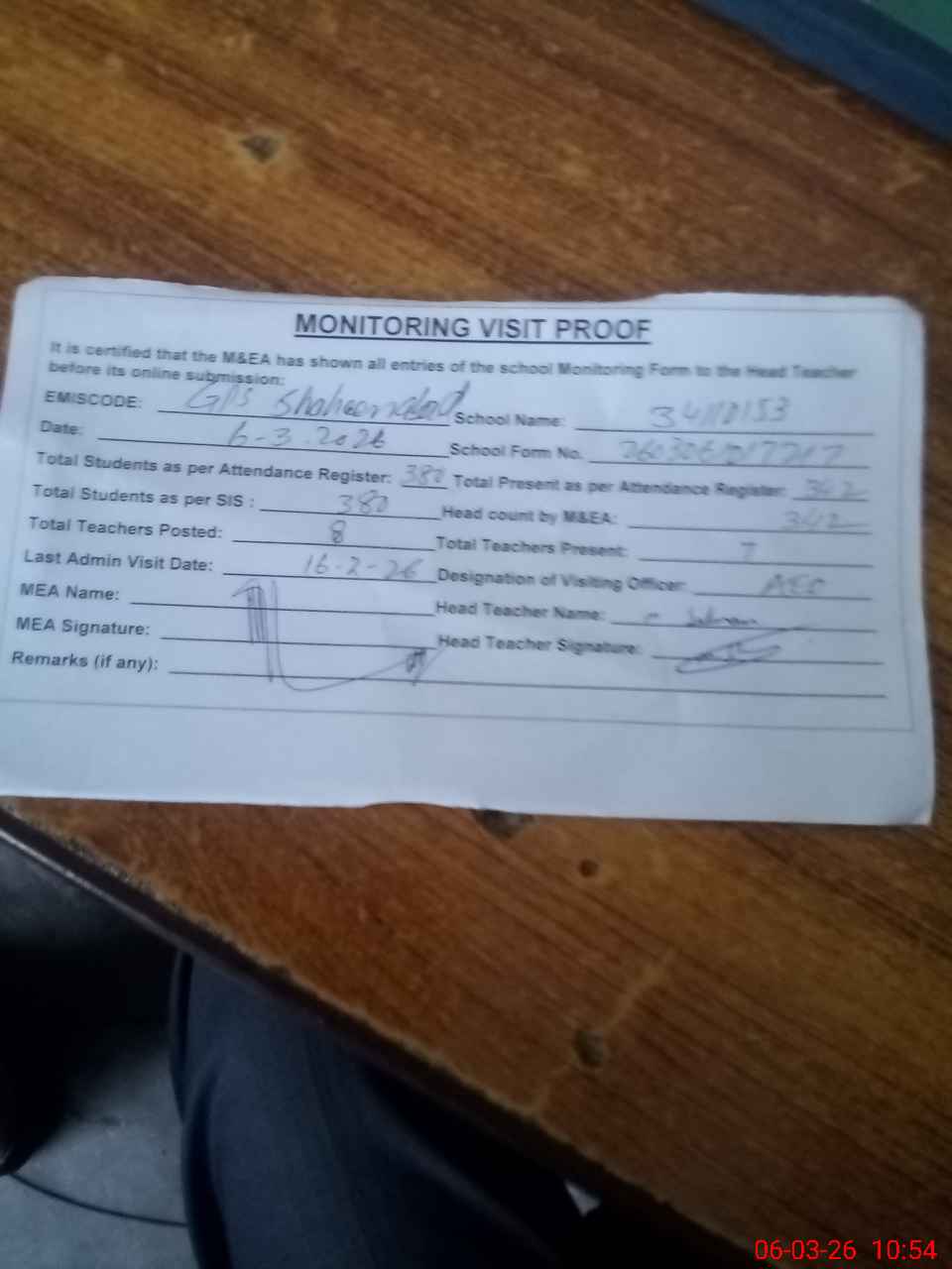 | Attendance Register | Head Teacher | MEA with School | Visit Proof |
