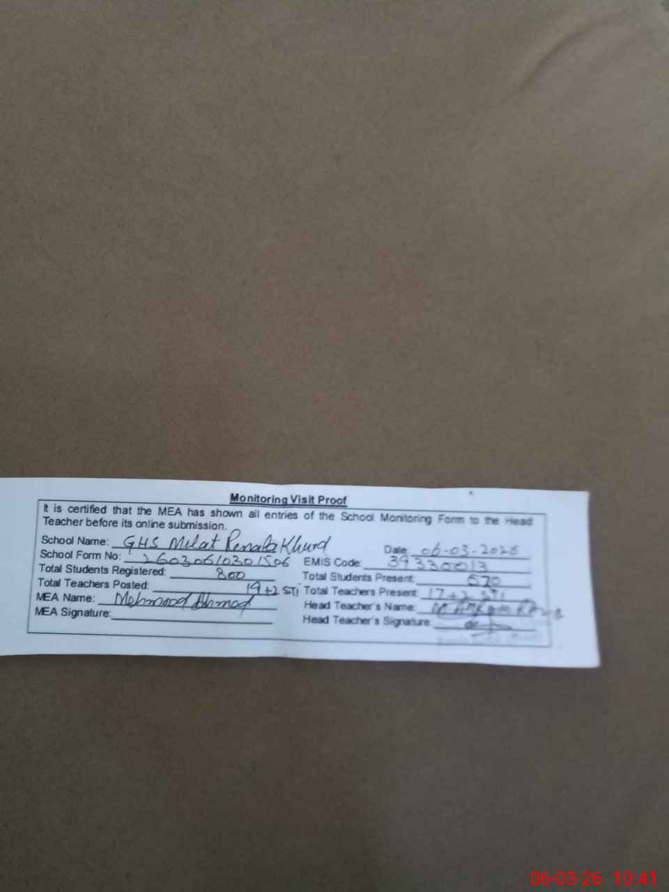 | Attendance Register | Head Teacher | MEA with School | Visit Proof |