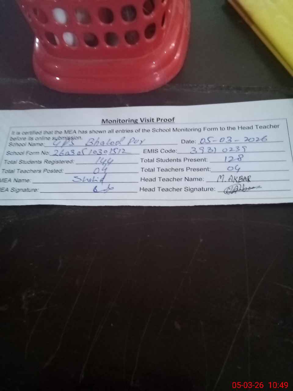 | Attendance Register | Head Teacher | MEA with School | Visit Proof |