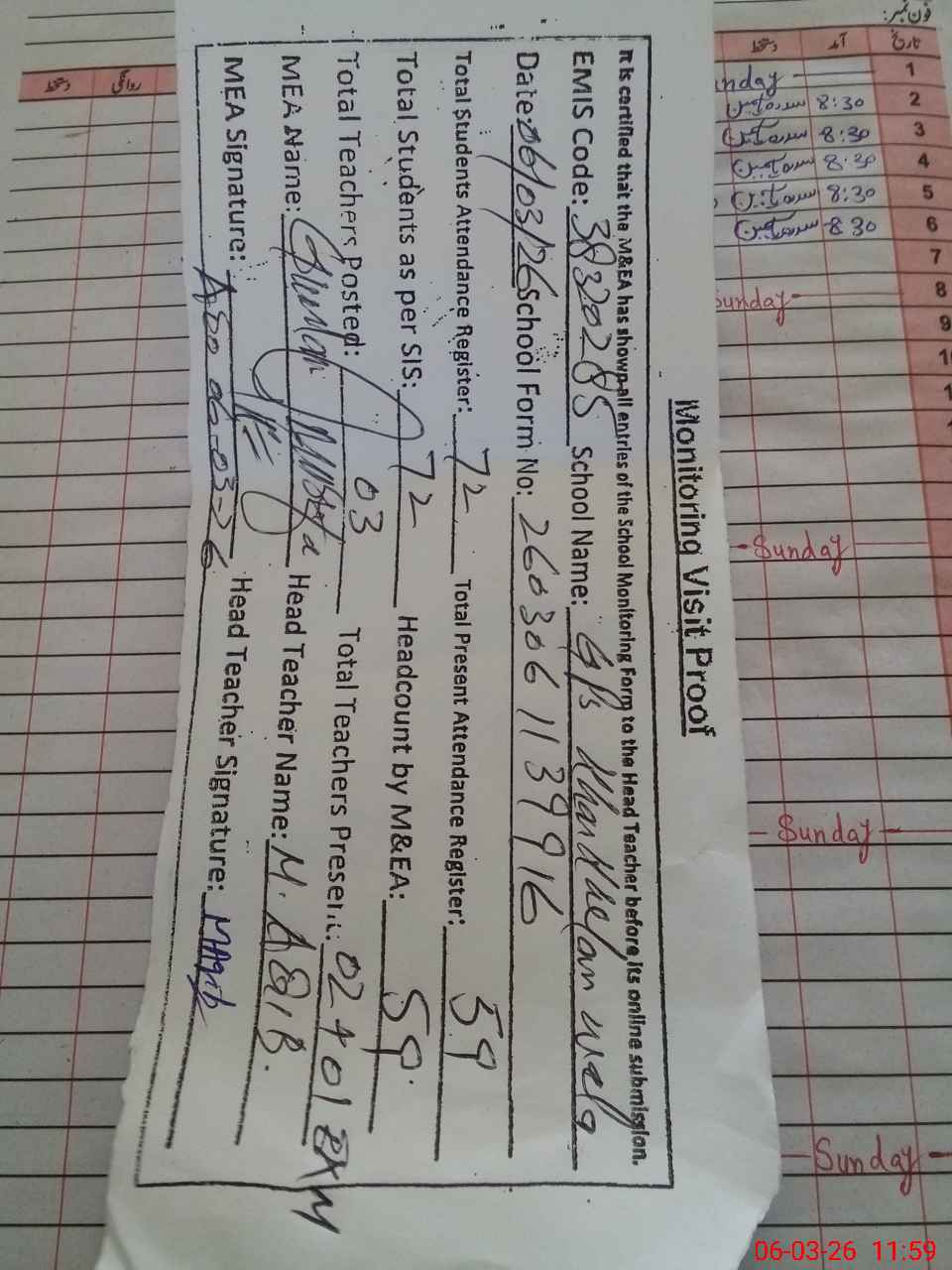 | Attendance Register | Head Teacher | MEA with School | Visit Proof |