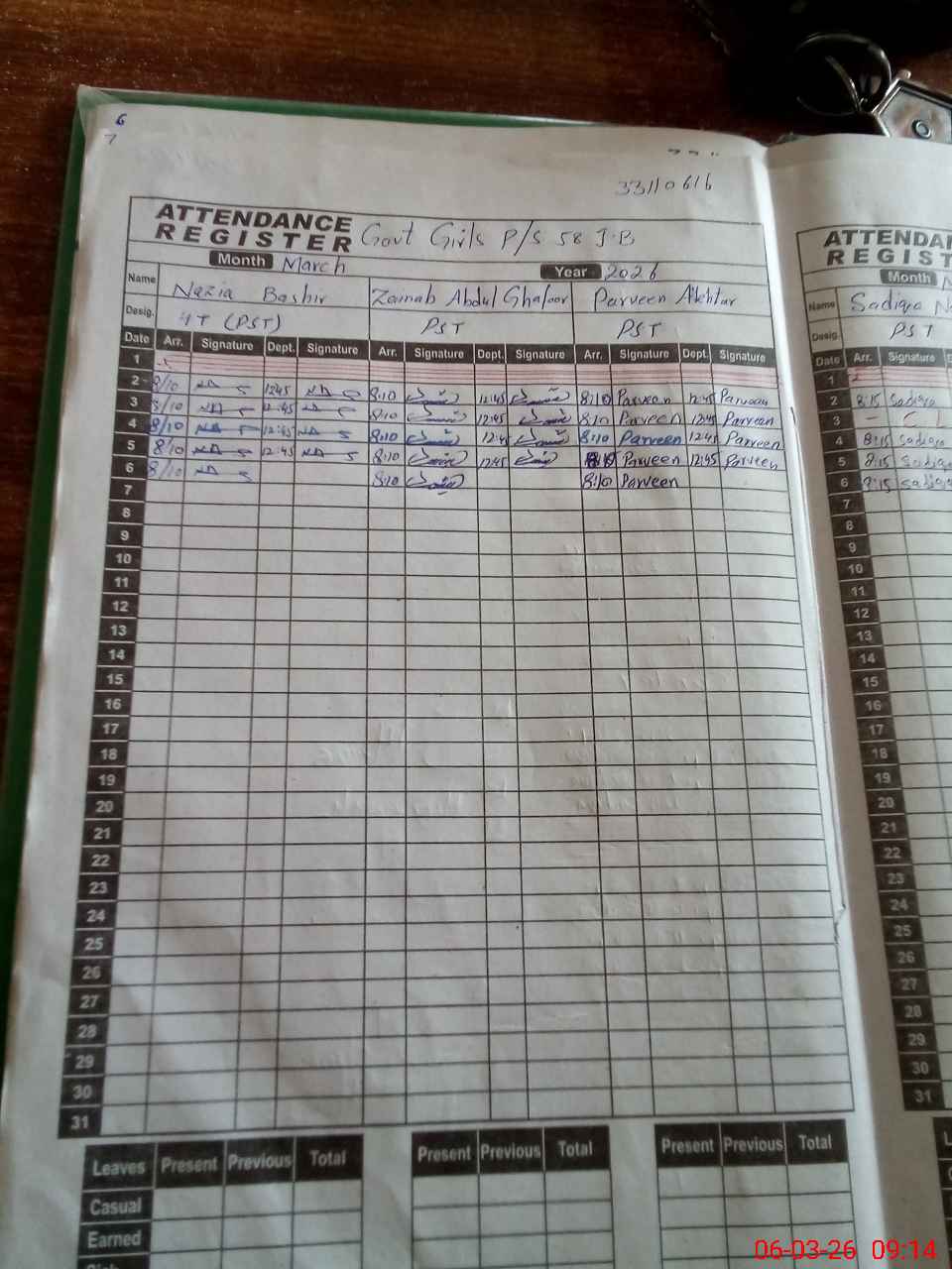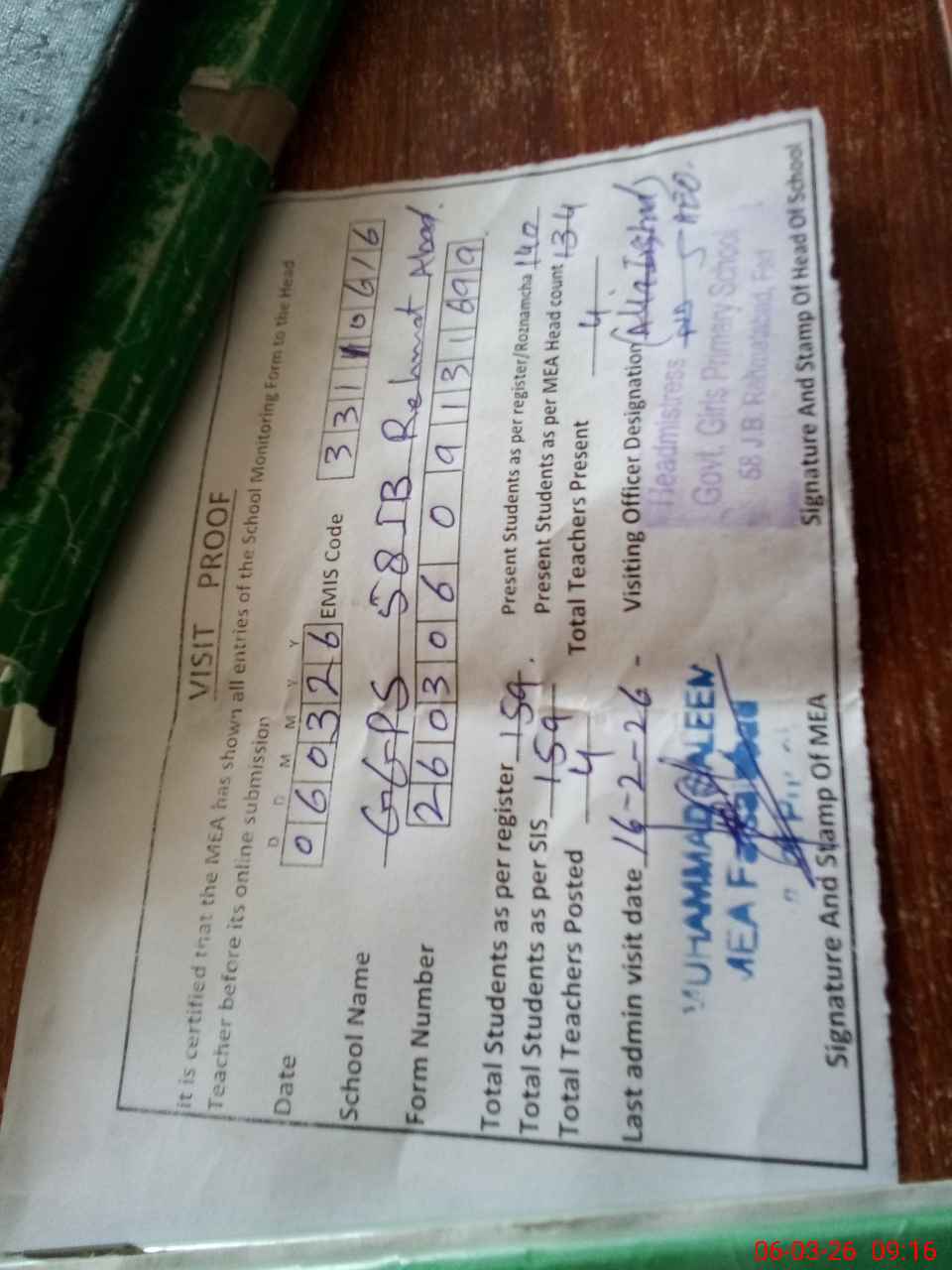 | Remarks (Use Separate Page if Required): AEO Alia Irshad visited date on log book 16 Feb 2026 only one entry and attendance register having two entries 16 Feb and 27Feb 2026 | |||||