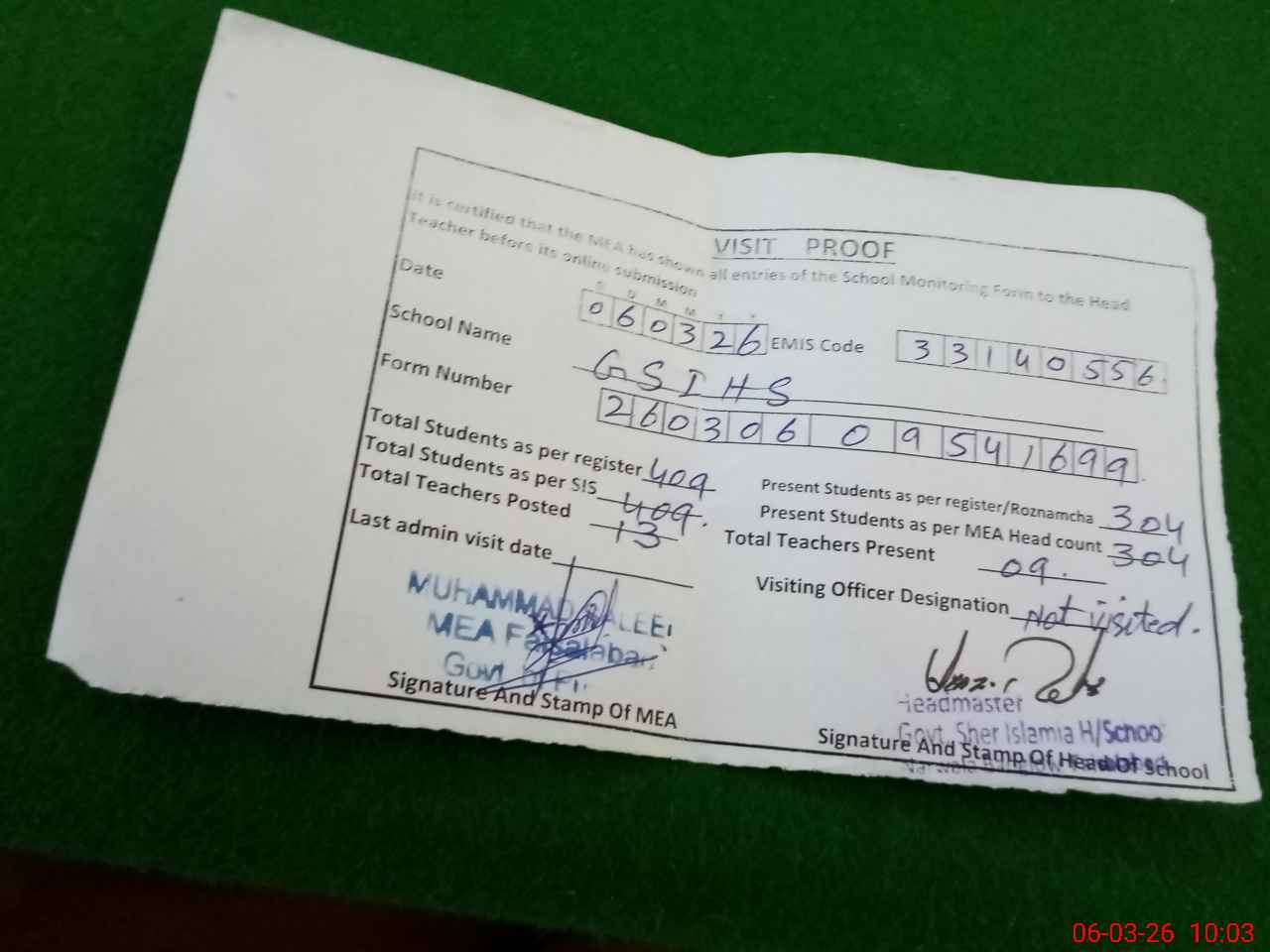 | Certified that this School was Inspected by the Undersigned MEA/DMO Today and the Information Stated Above is as Per Record. | |||||