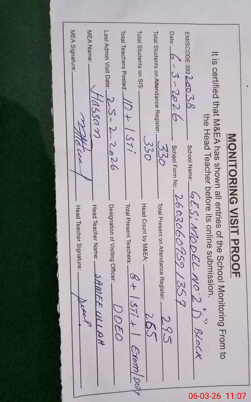| EMIS Code: 39220038 | Name of School: GES MODEL NO. 2 D BLOCK ARIF WALA | |||