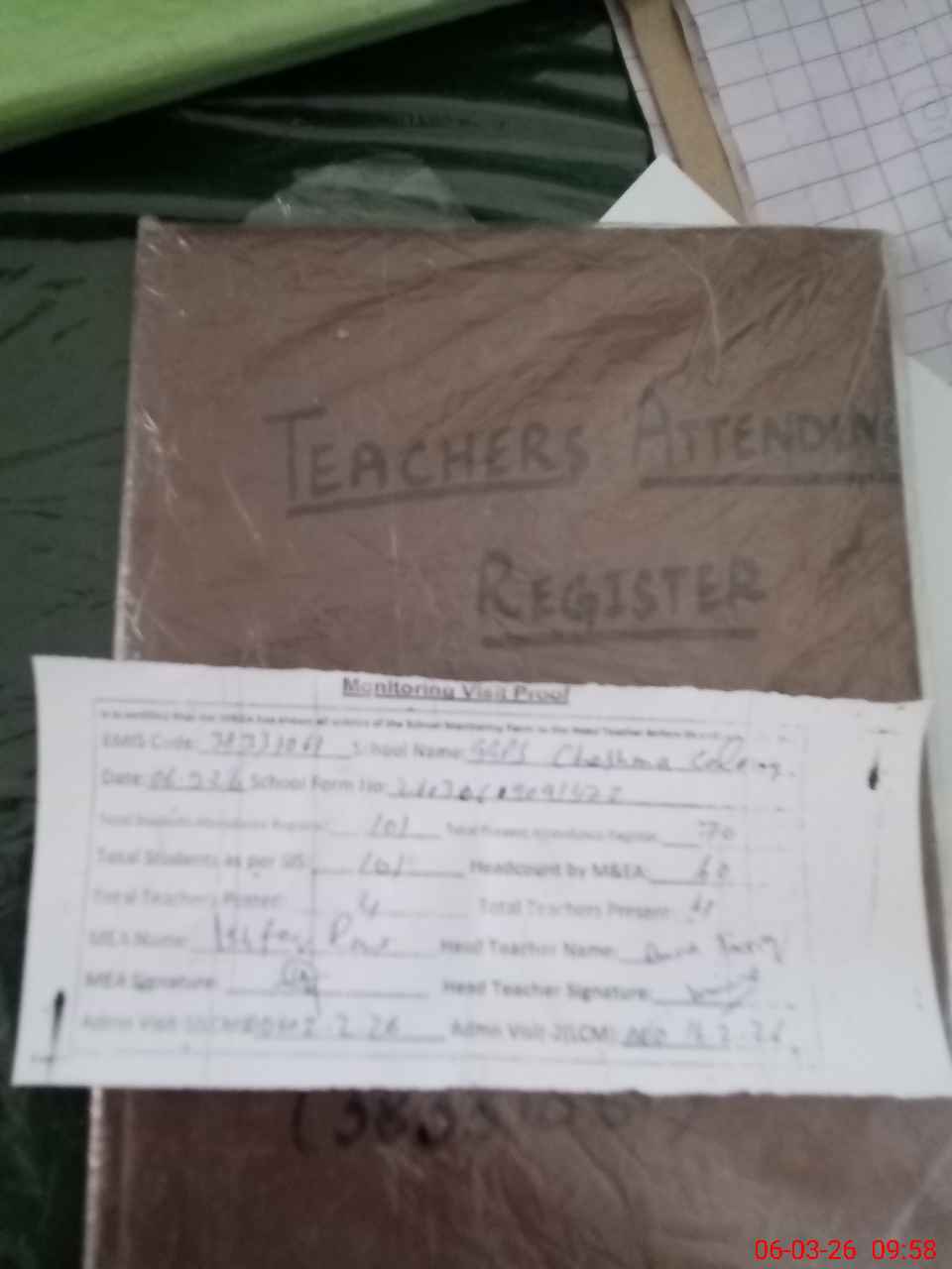 | Attendance Register | Head Teacher | MEA with School | Visit Proof |