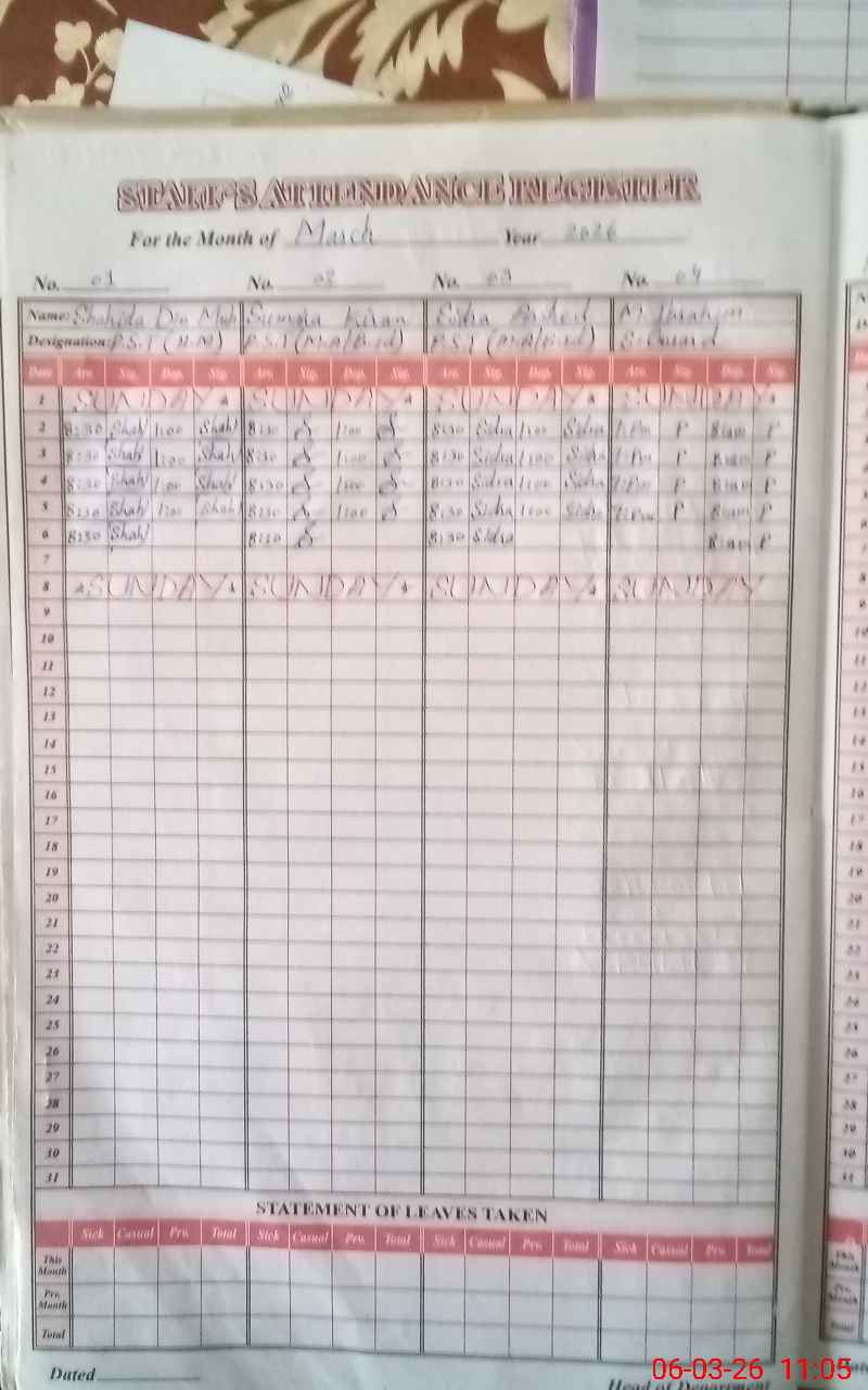 | CNIC | Full Name | Designation | R/C | Absence During Last Calender Month |