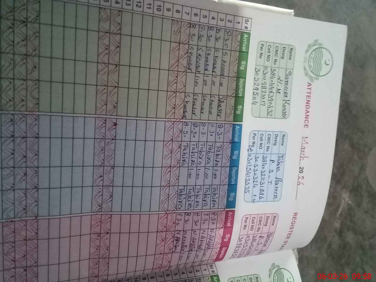 | CNIC | Full Name | Designation | R/C | Absence during last cal. month |