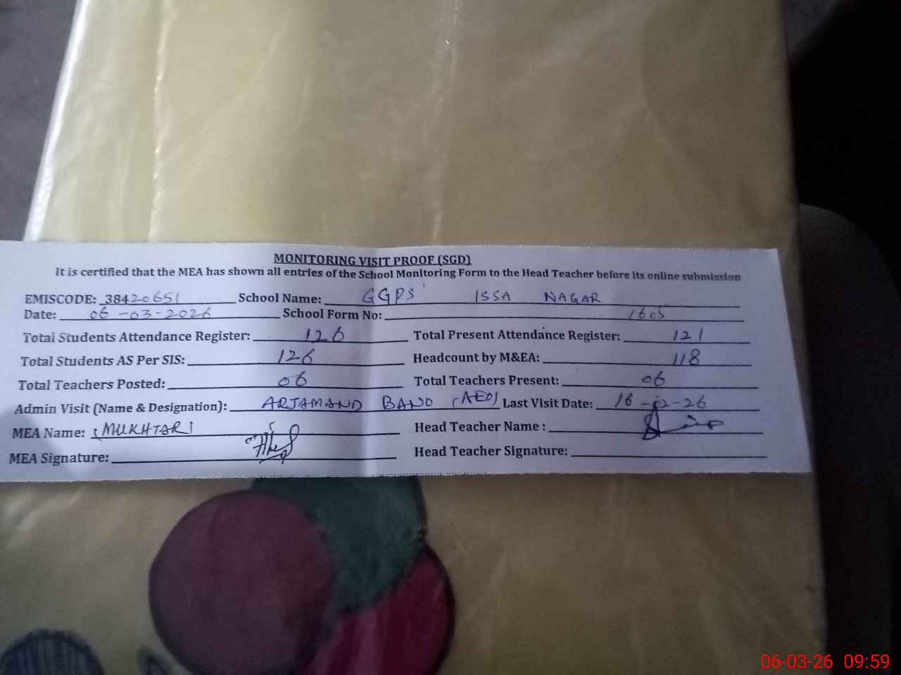 | Attendance Register | Head Teacher | MEA with School | Visit Proof |